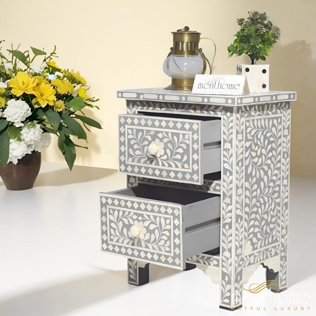 Bone Inlay Grey Floral 2 Drawer Nightstand | Luxury Handmade Bedside Table