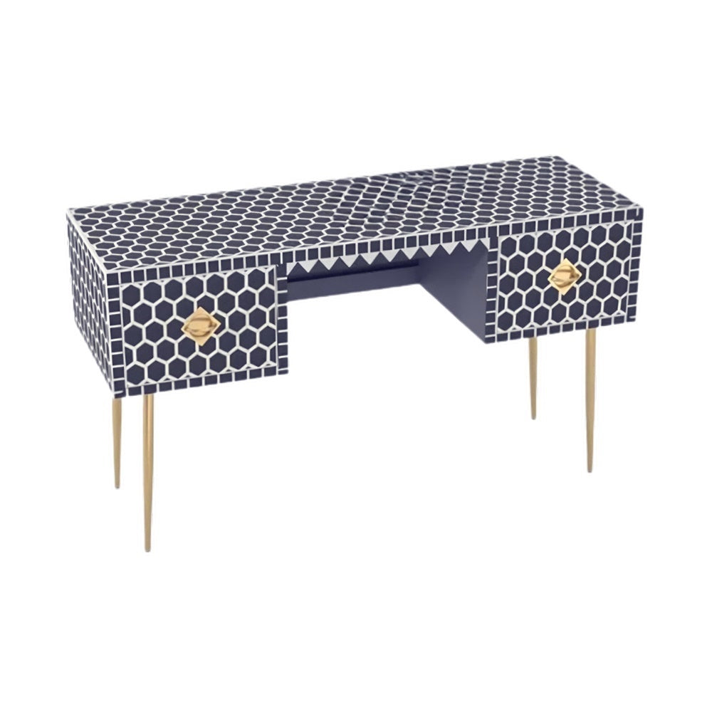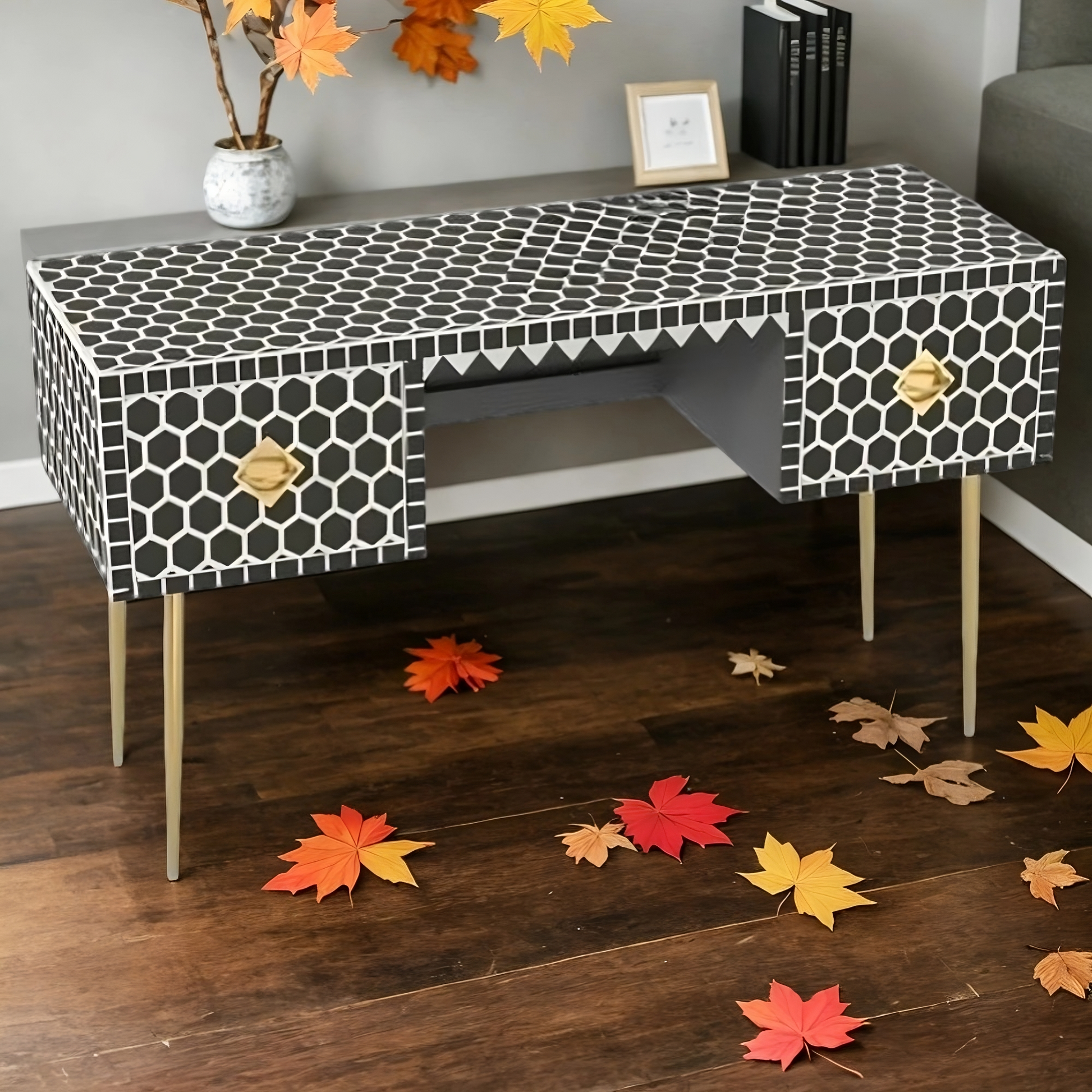 Totally unique and one of a kind, this small, bone-inlay Indian Bone Inlay Optical Desk is inlaid with fragments of mirrored glass. Each fragment of glass is hand cut with special glass-cutting scissors, and then laid out by skilled craftsmen in these Rangoli patterns. The effect as you walk past this chest is to see a shimmer of repeating reflections. If you become the proud owner of this hand-crafted inlaid Bone Inlay Optical Desk you could also order another glass inlaid item in the same color using our bespoke order service. Keep the room?and accessories minimal in order to emphasize the rich beauty of the statement piece.\n\n\nBRAND: Menthome\n\n\n\nART-TYPE: Bone/MOP Inlay Wooden Furniture\n\n\n\nMATERIAL: MDF, Bone, Wood, Iron Stand where applicable\n\n\n\nDIMENSIONS: All Dimensions are in Inches. Please send us a message for custom Sizes and Colors\n\n\n\n\n\nCOLOR: Selected from the options. Contact us for custom orders.\n\n\n\nProcessing Time:?15 - 20?Working Days\n\n\n\nDelivery Time:?5 - 10?Working Days (Customs processing adds extra days)\n\n\n\nNote:\n\n