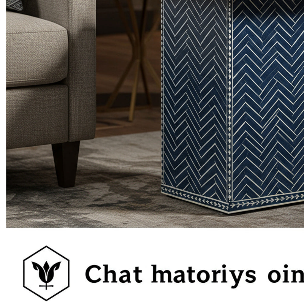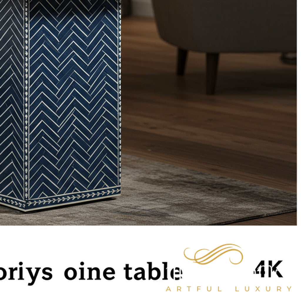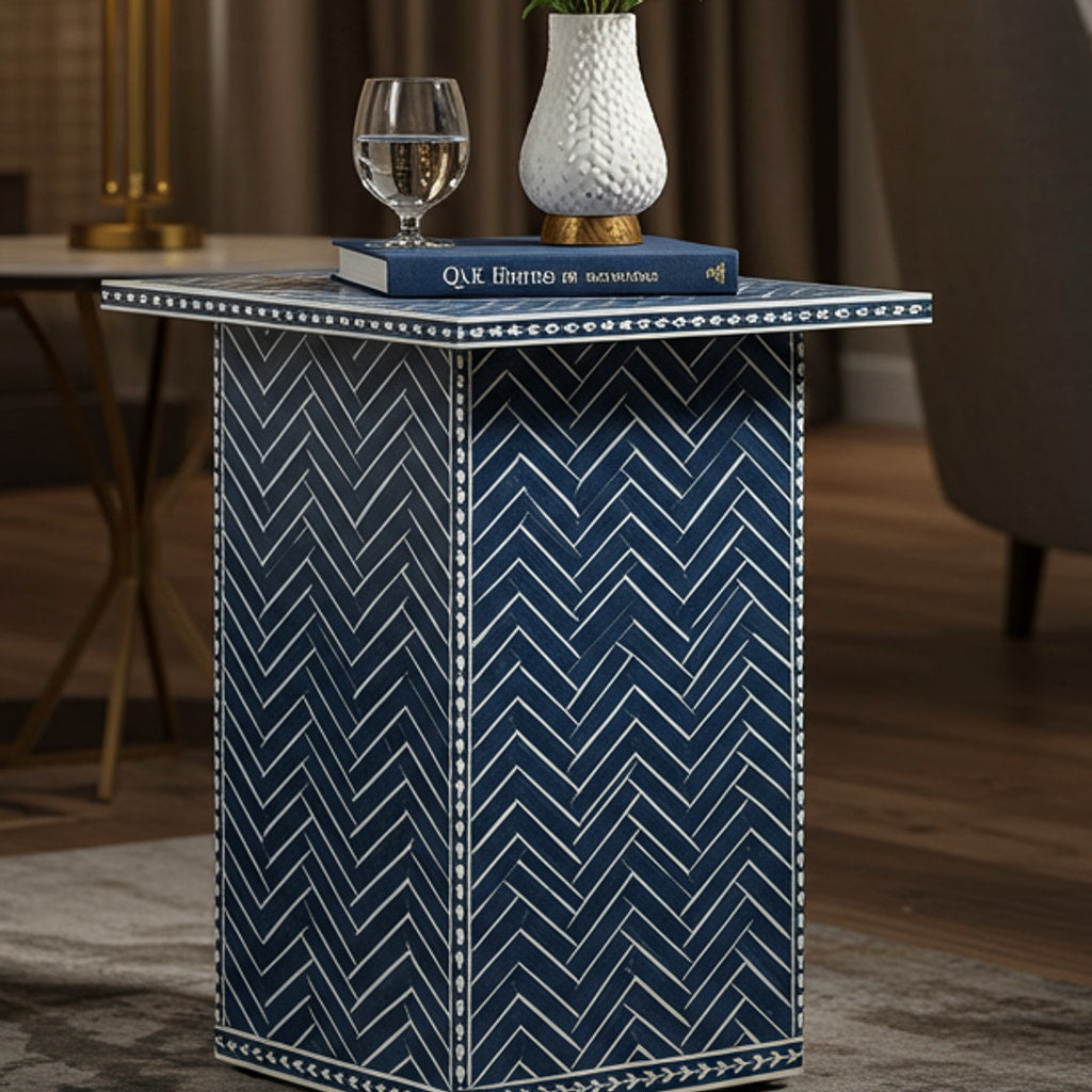 This elegant stone side table features a beautiful herringbone pattern in deep navy blue with white accents. Its compact, sturdy design makes it an ideal piece for living rooms or lounge areas, providing both functionality and style. Perfect for displaying decorative items or holding a book and a glass of water.