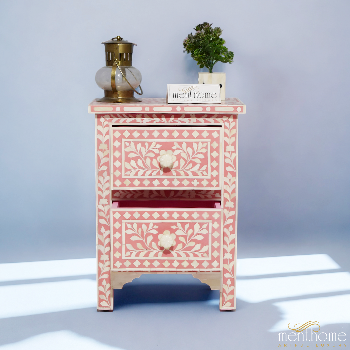 Dark Pink Bone Inlay Handmade Bedside Table with Two Drawers (Copy) | Luxury Handmade Bedside Table
