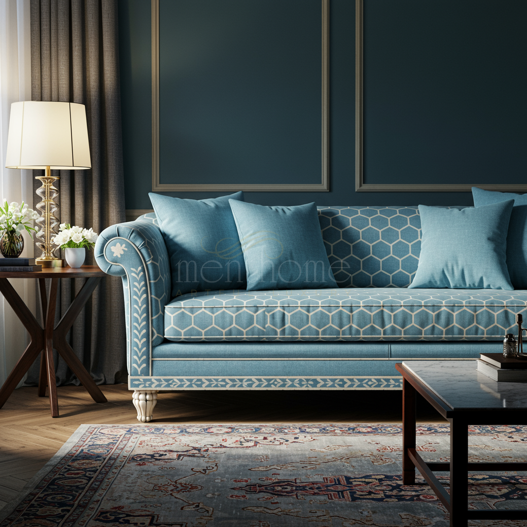 Elegant Blue Inlay Sofa with Patterned Upholstery | Luxury Handmade Sofa