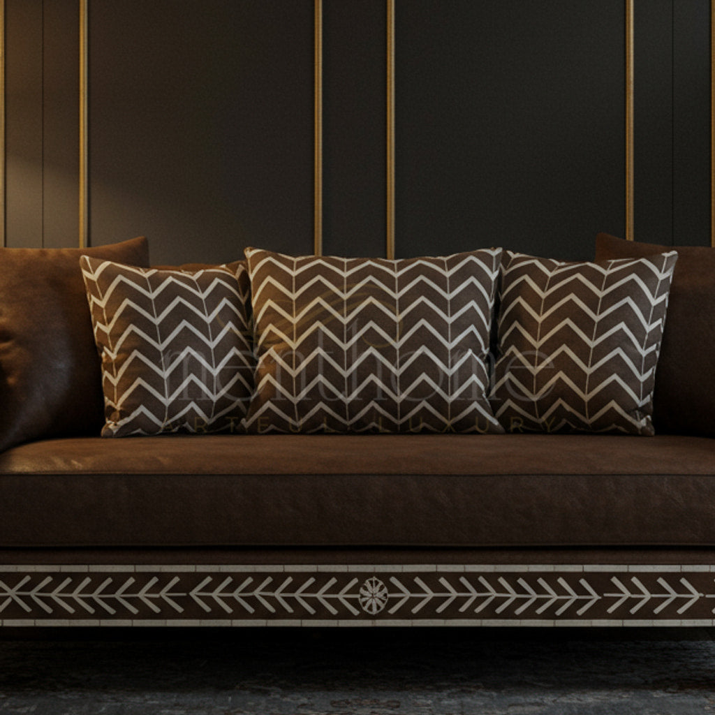 Elegant Hand-Inlaid Leather Sofa with Geometric Cushions | Luxury Handmade Sofa