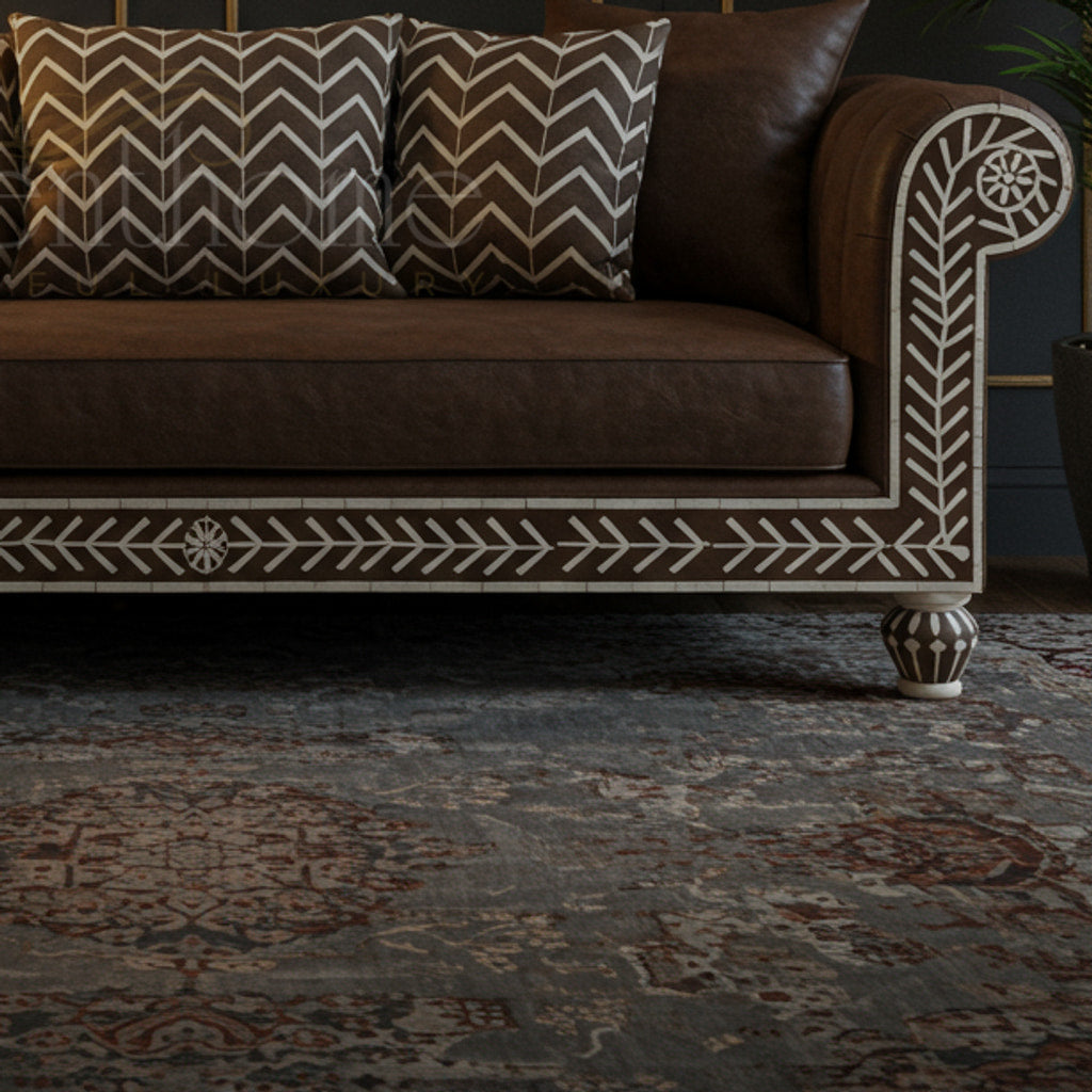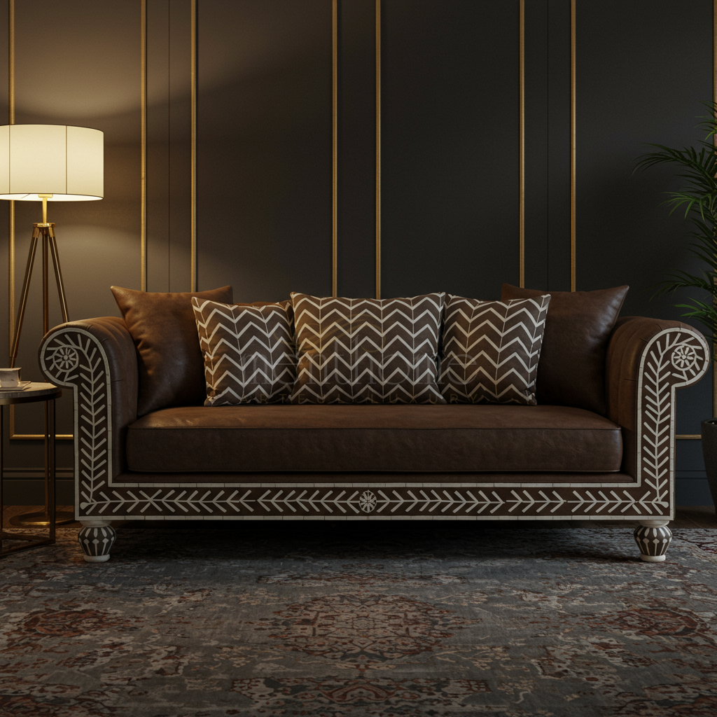 This exquisite leather sofa features intricate hand-inlaid geometric designs on the frame, complemented by plush cushions with matching patterns. Designed to add a touch of luxury and sophistication to any living space, this sofa is perfect for both comfort and style.