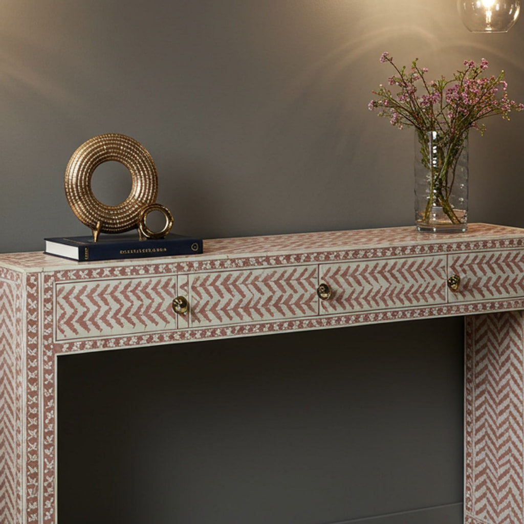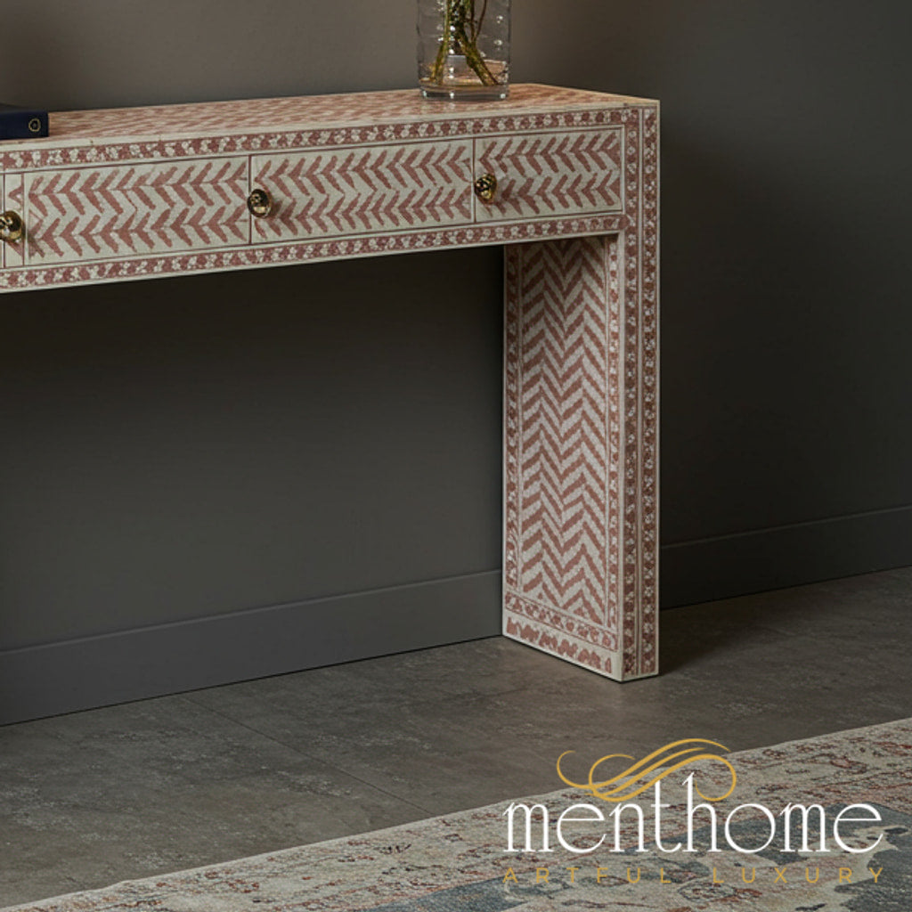 This exquisite console table features a handcrafted bone inlay design with intricate geometric patterns in soft hues. It offers three functional drawers with brass knobs, perfect for storage and organizing small essentials. Its sleek and elegant form fits beautifully in entryways, living rooms, or hallways.
