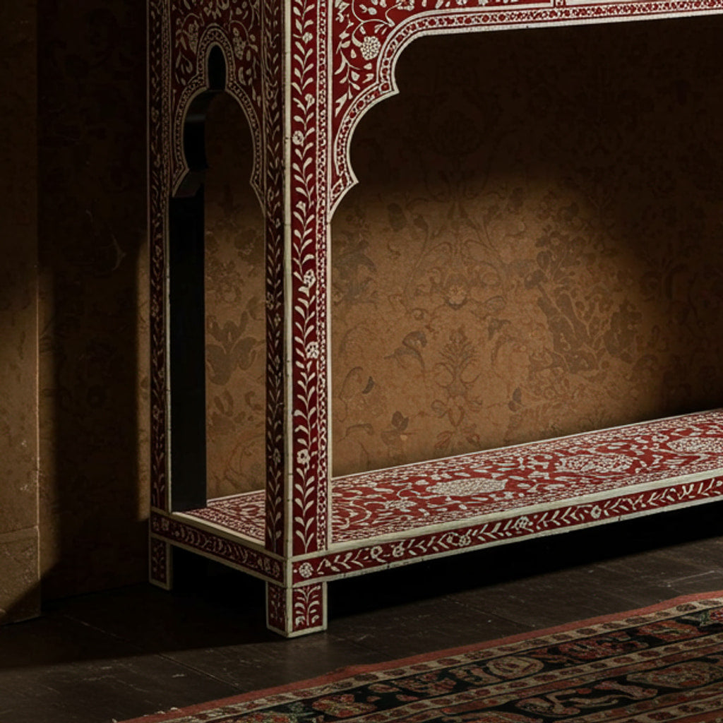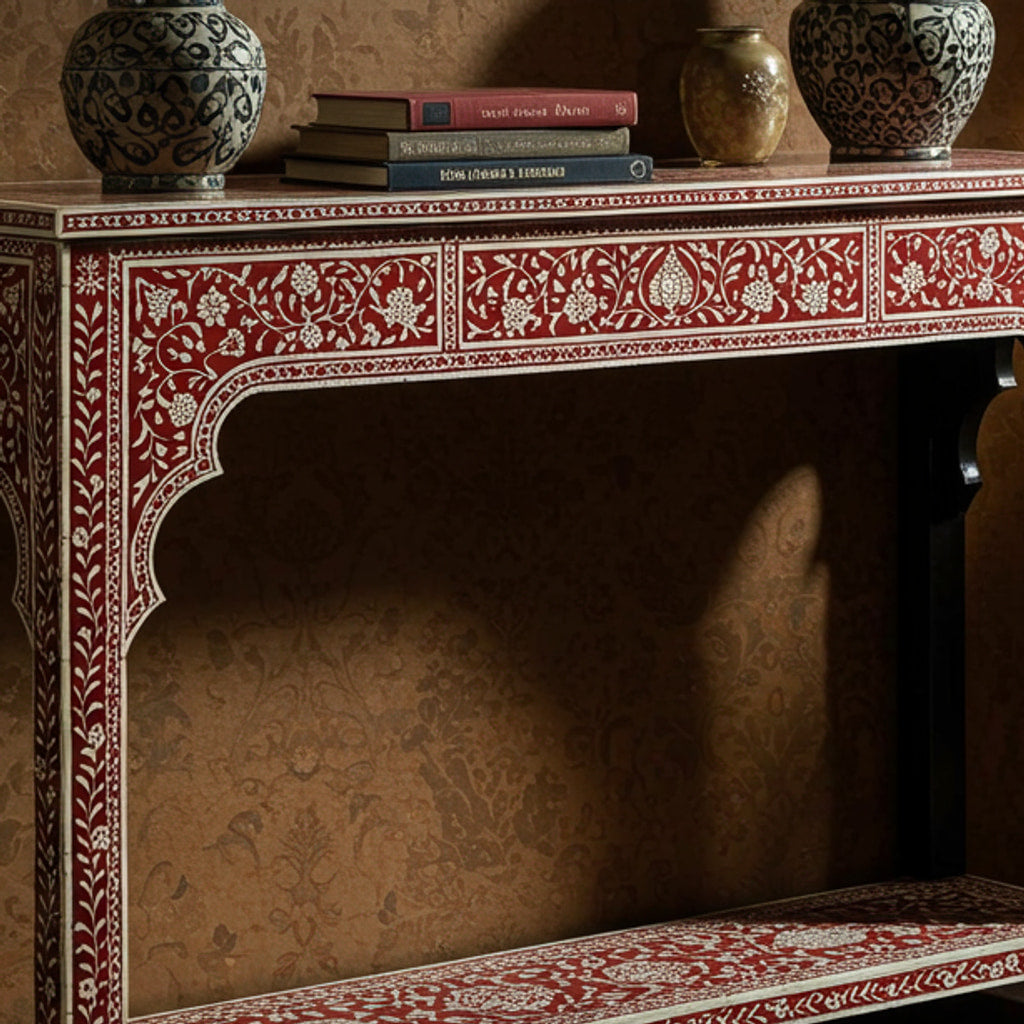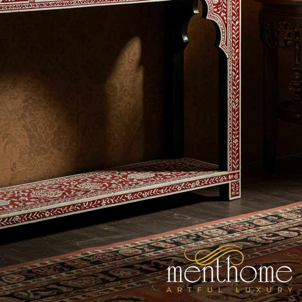 This exquisite handcrafted console table features intricate bone inlay work with elaborate floral and vine motifs on a rich red background. It blends traditional craftsmanship with timeless elegance, perfect for adding a statement piece to your hallway, living room, or entryway.