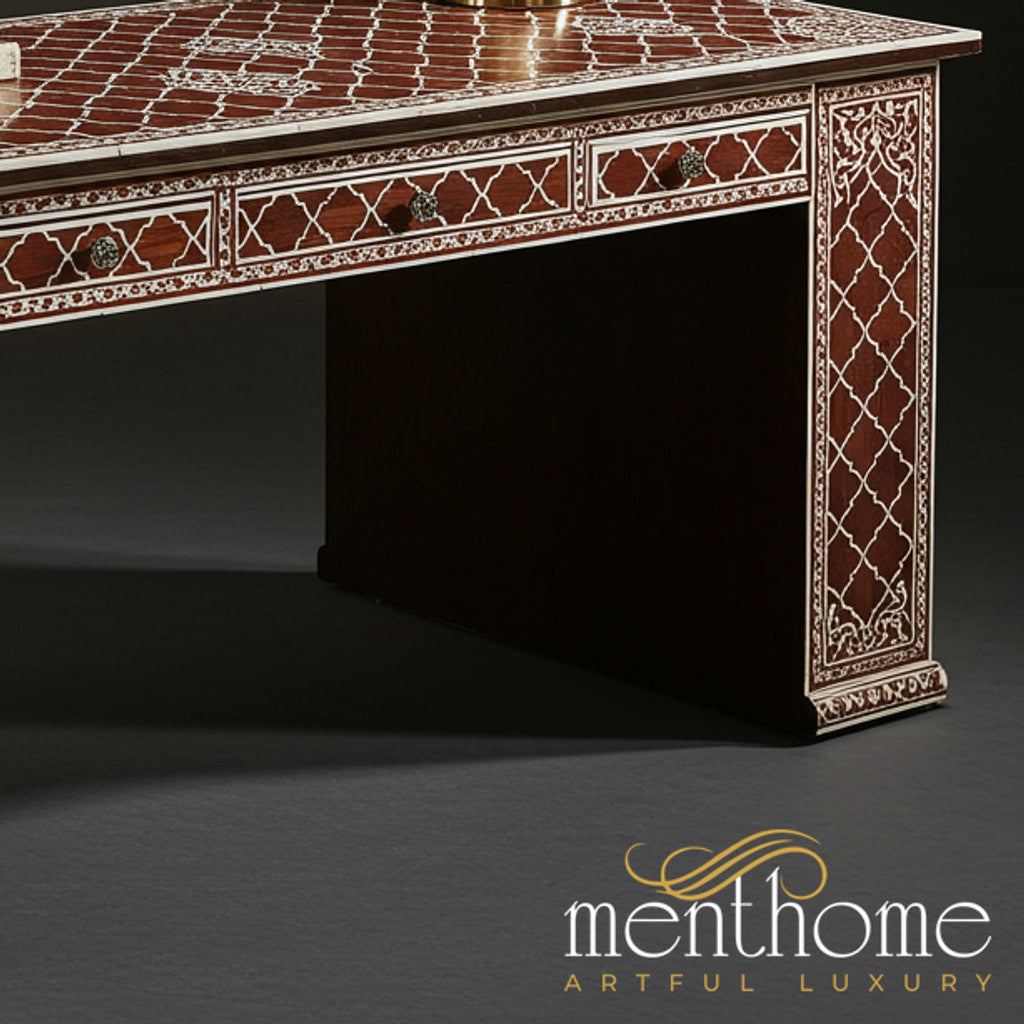 A beautifully handcrafted wooden desk featuring intricate white inlay on a rich reddish-brown finish. This elegant desk combines traditional craftsmanship with practical design, including three drawers for ample storage. Ideal for enhancing the aesthetic appeal of any office or study space.