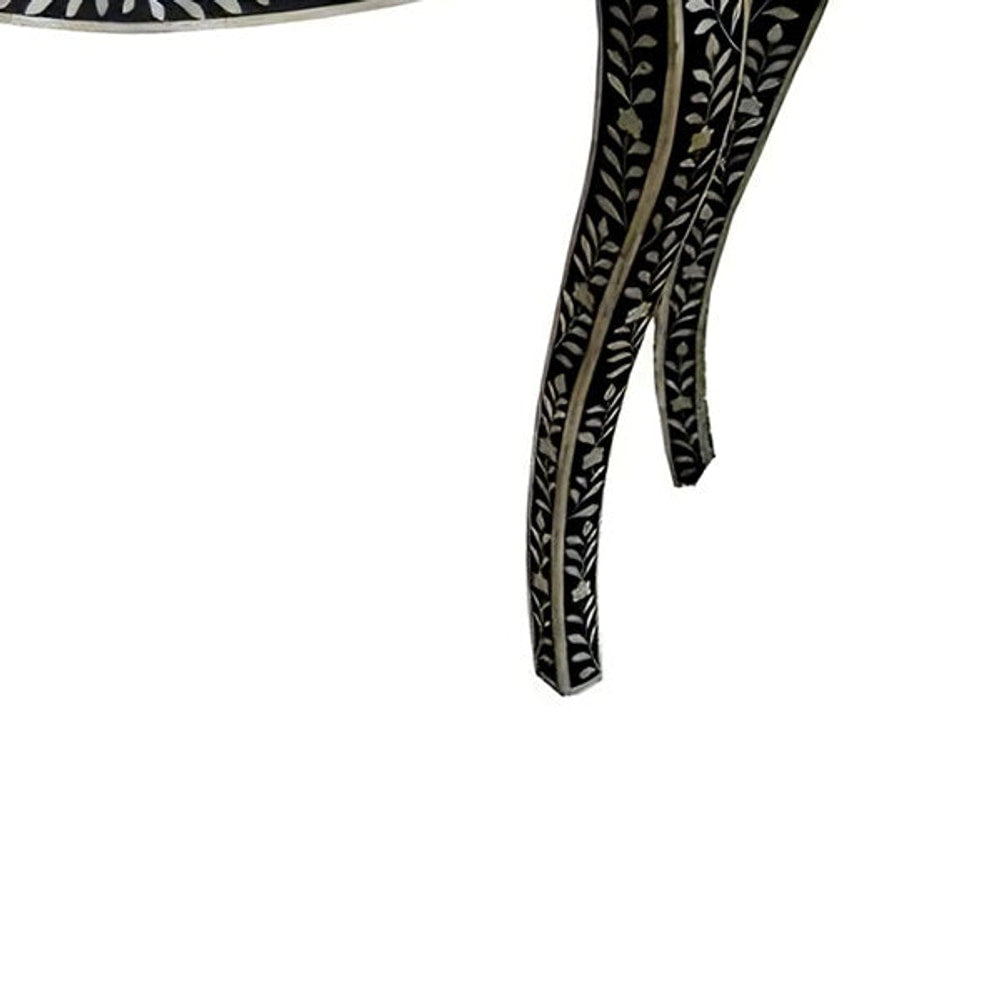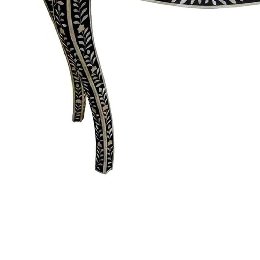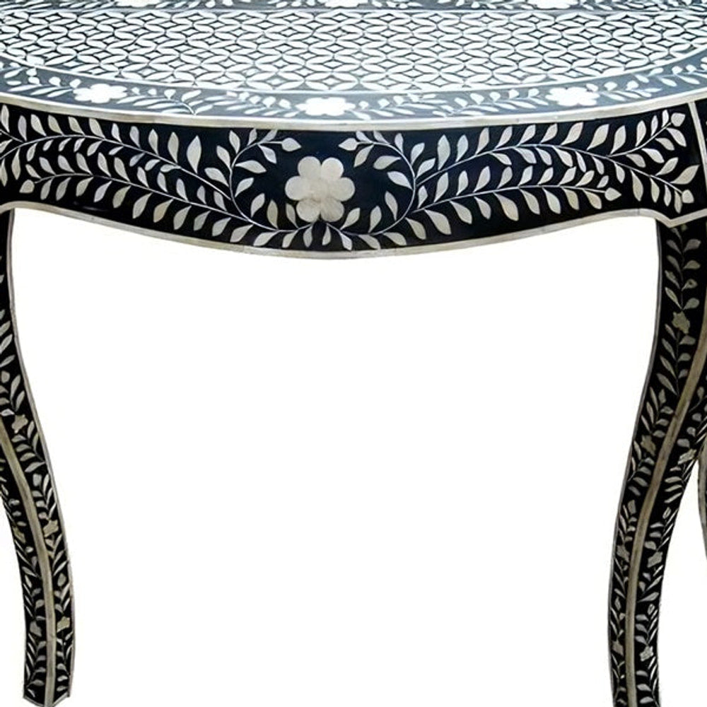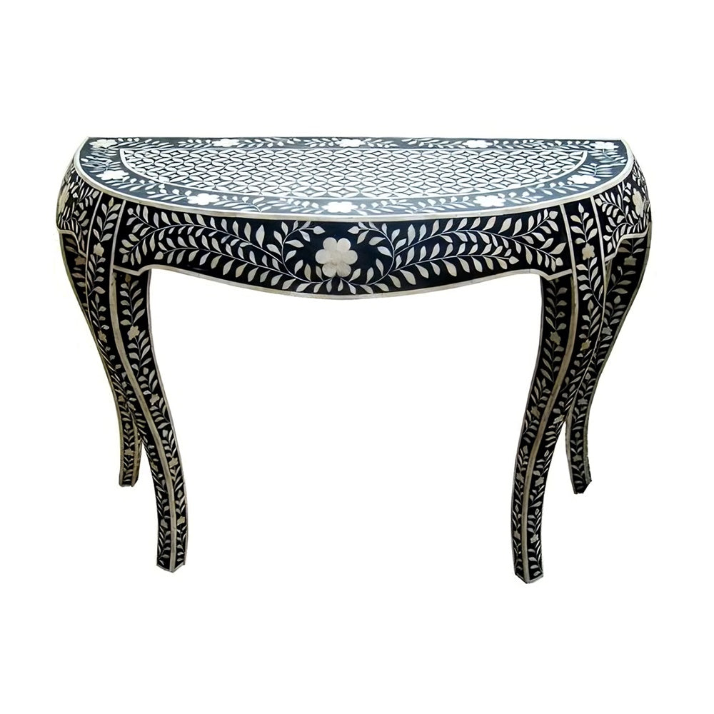 Semi-Circular Console Table Bone Inlay Handmade is an exquisite piece of furniture, showcasing intricate floral and geometric patterns meticulously handcrafted from blue-toned bone inlays. This console table combines artistic elegance with practicality, offering ample storage in its two drawers. Its captivating design adds a touch of opulence to any space, making it a standout addition to your home decor. \n