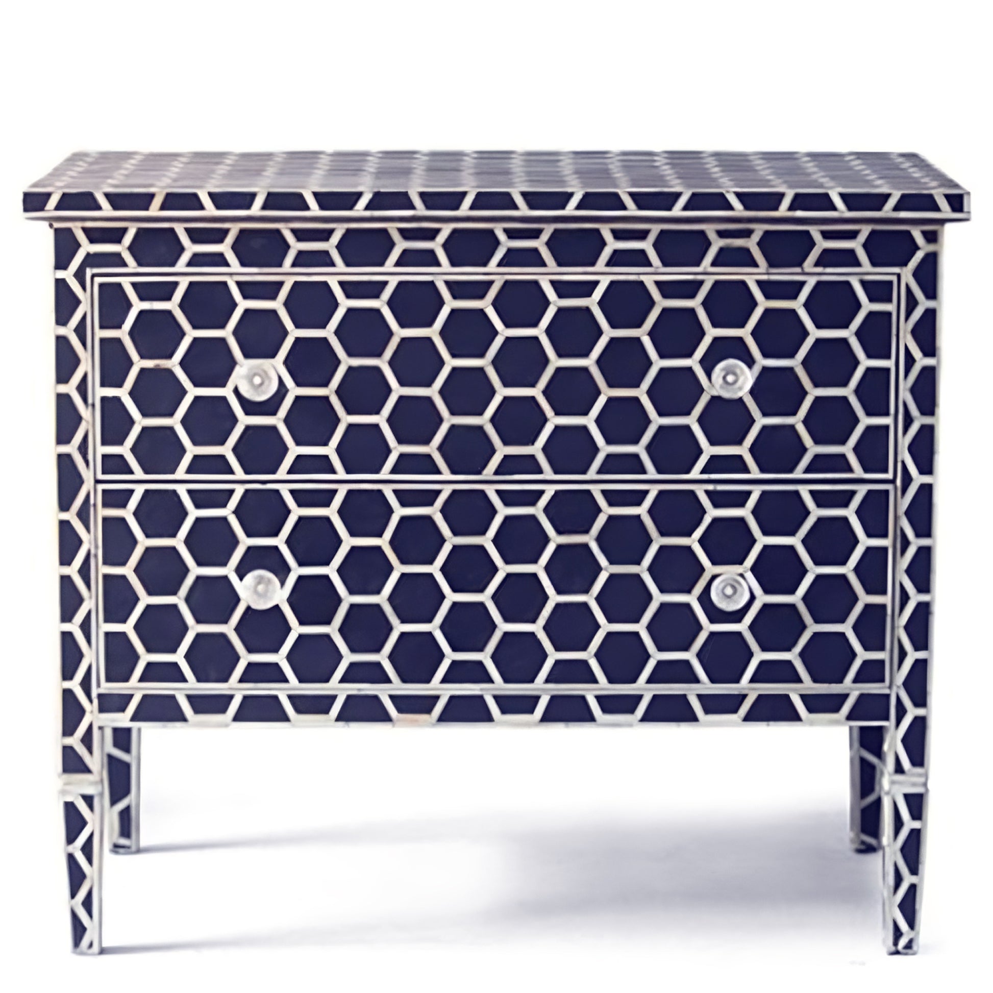 Totally unique and one of a kind, this small, bone inlay Indian Sideboard dresser is inlaid with fragments of mirrored glass. Each fragment of glass is hand cut with special glass cutting scissors, and then laid out by skilled craftsmen in these Rangoli patterns. The effect as you walk past this chest is to see a shimmer of repeating reflections. If you become the proud owner of this hand-crafted inlaid PERAL INLAY Sideboard dresser  you could also order another glass inlaid item in the same color using our bespoke order service. Keep the room’s accessories minimal in order to emphasize the rich beauty of the statement piece. \n