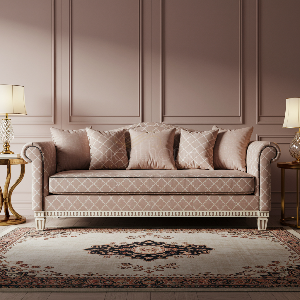 A sophisticated and comfortable sofa featuring a beautiful inlay pattern upholstery in soft blush tones. This sofa combines classic design elements with modern comfort, making it a perfect centerpiece for any luxury living room setting.