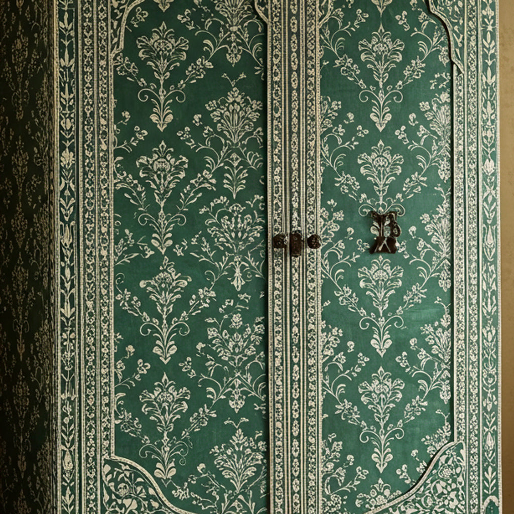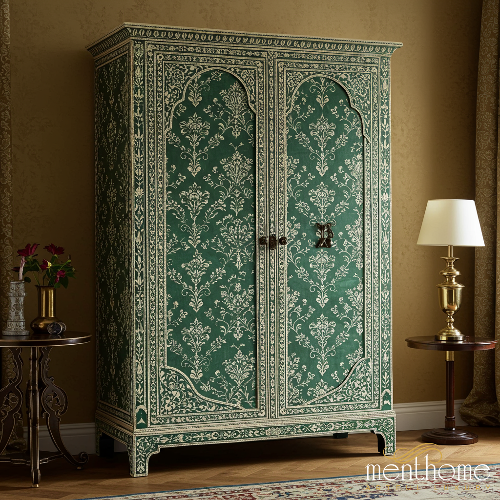 A beautifully handcrafted wooden wardrobe featuring an intricate green and white floral pattern. This elegant piece of furniture combines traditional artistry with practical storage, making it an ideal addition to any bedroom or living space.
