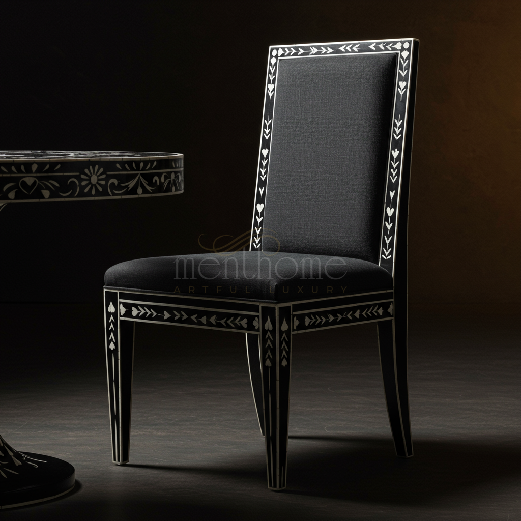 The Inlay Chair combines exquisite craftsmanship with elegant design, featuring hand-crafted inlay patterns on a sleek black frame. Upholstered in rich black fabric, this chair adds a sophisticated touch to any luxury interior.