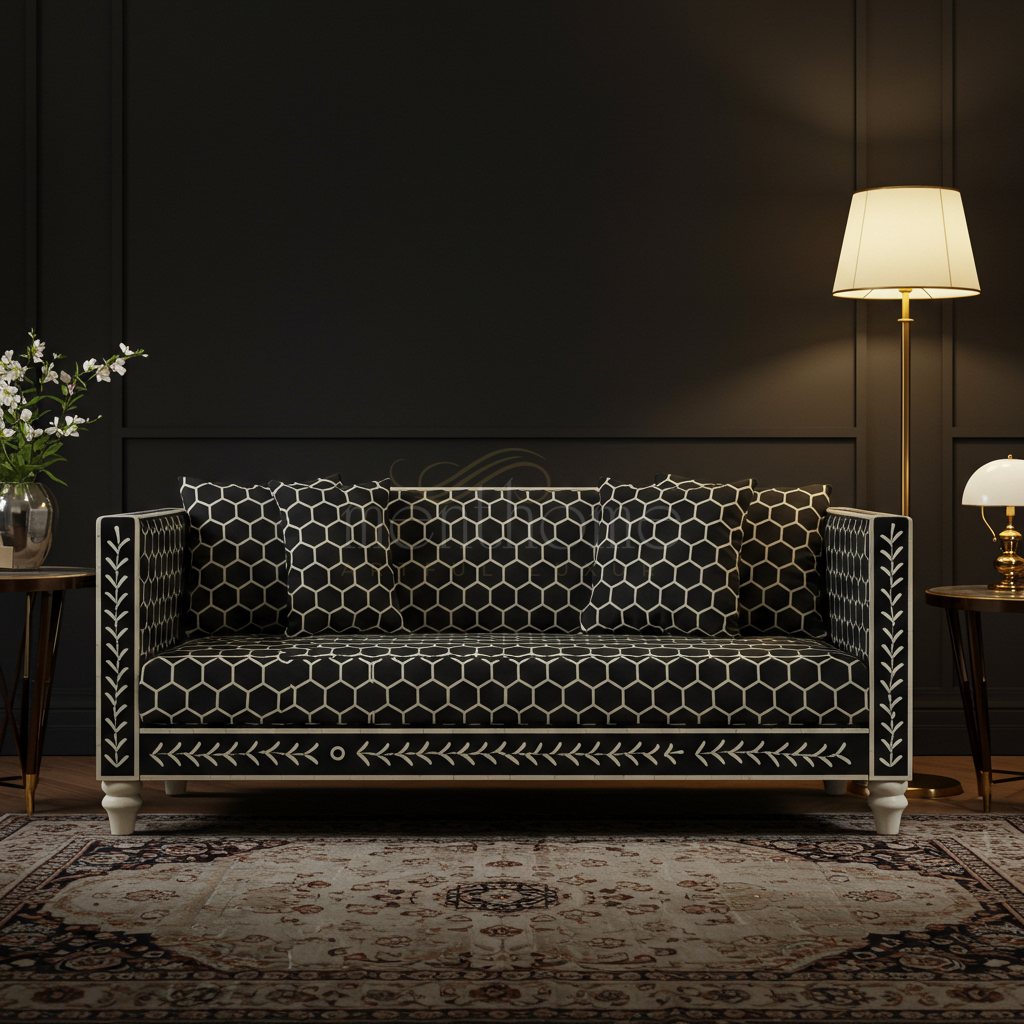 A sophisticated and elegant inlay sofa featuring a striking black upholstery with a geometric honeycomb pattern complemented by intricate white floral inlay details on the frame. This three-seater sofa combines artistic craftsmanship with comfort, making it a perfect centerpiece for upscale living rooms or lounges.