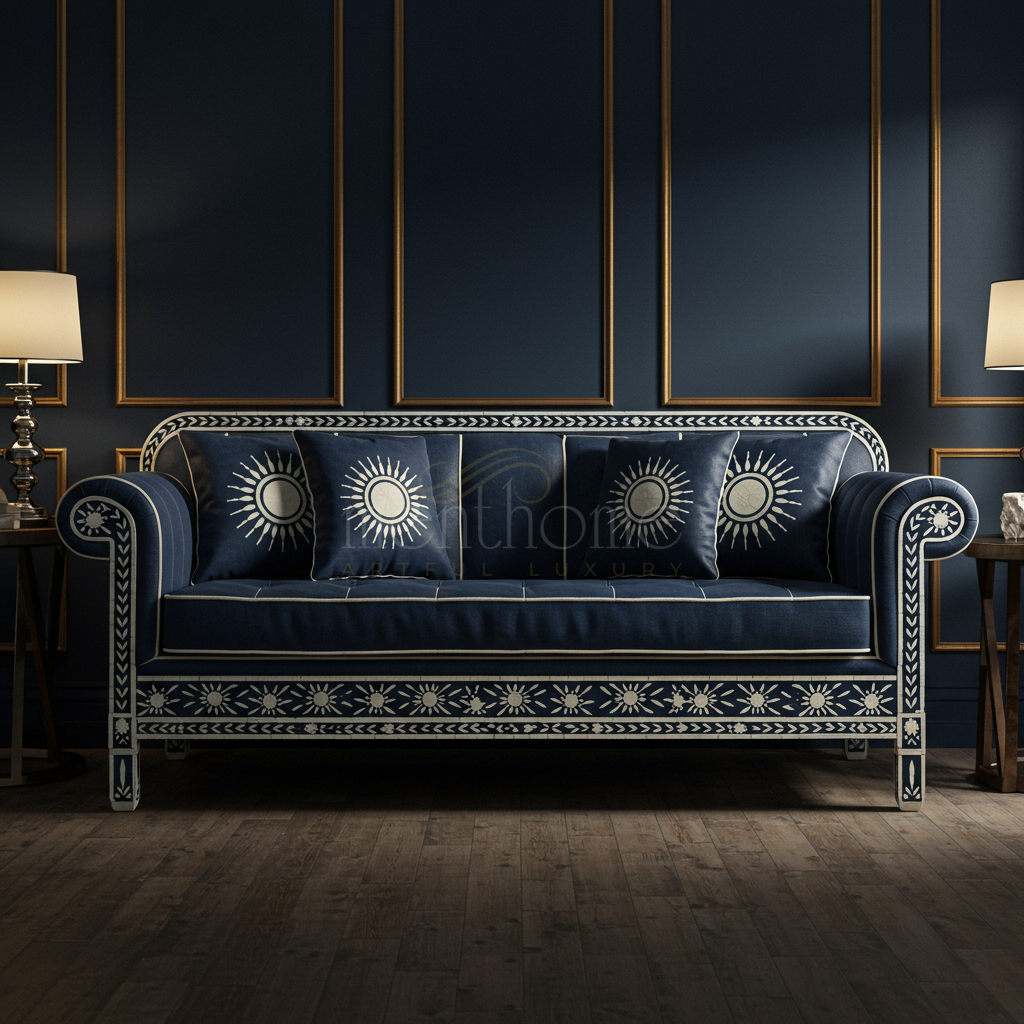 This exquisite luxury sofa features intricate white inlay work on a rich blue frame, complemented by matching cushions adorned with elegant sunburst motifs. Crafted to elevate any living space with a blend of classic artistry and modern comfort.