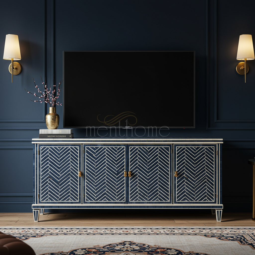 This elegant TV cabinet features a striking blue finish with intricate white inlay chevron patterns, combining traditional craftsmanship with modern luxury. Perfect for enhancing any living room, it offers ample storage space with four doors and golden handles, set on stylish tapered legs.