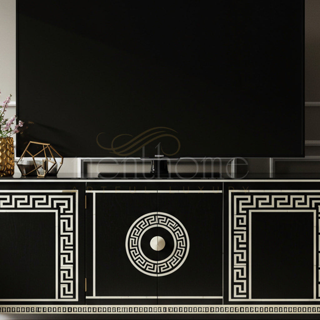 This exquisite inlay TV cabinet features a striking black finish enhanced by elegant white Greek key pattern detailing. Designed for luxury living spaces, it combines classical artistry with practical storage solutions. Crafted to accommodate modern entertainment needs while elevating room aesthetics.