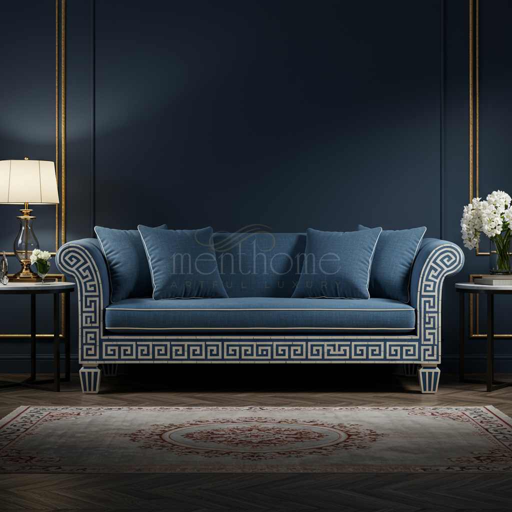This exquisite blue inlay sofa showcases artful luxury with its intricate geometric Greek key patterns, plush cushioning, and elegant rolled arms. Perfect for sophisticated living spaces, this sofa combines classic design with premium craftsmanship to elevate your interior decor.