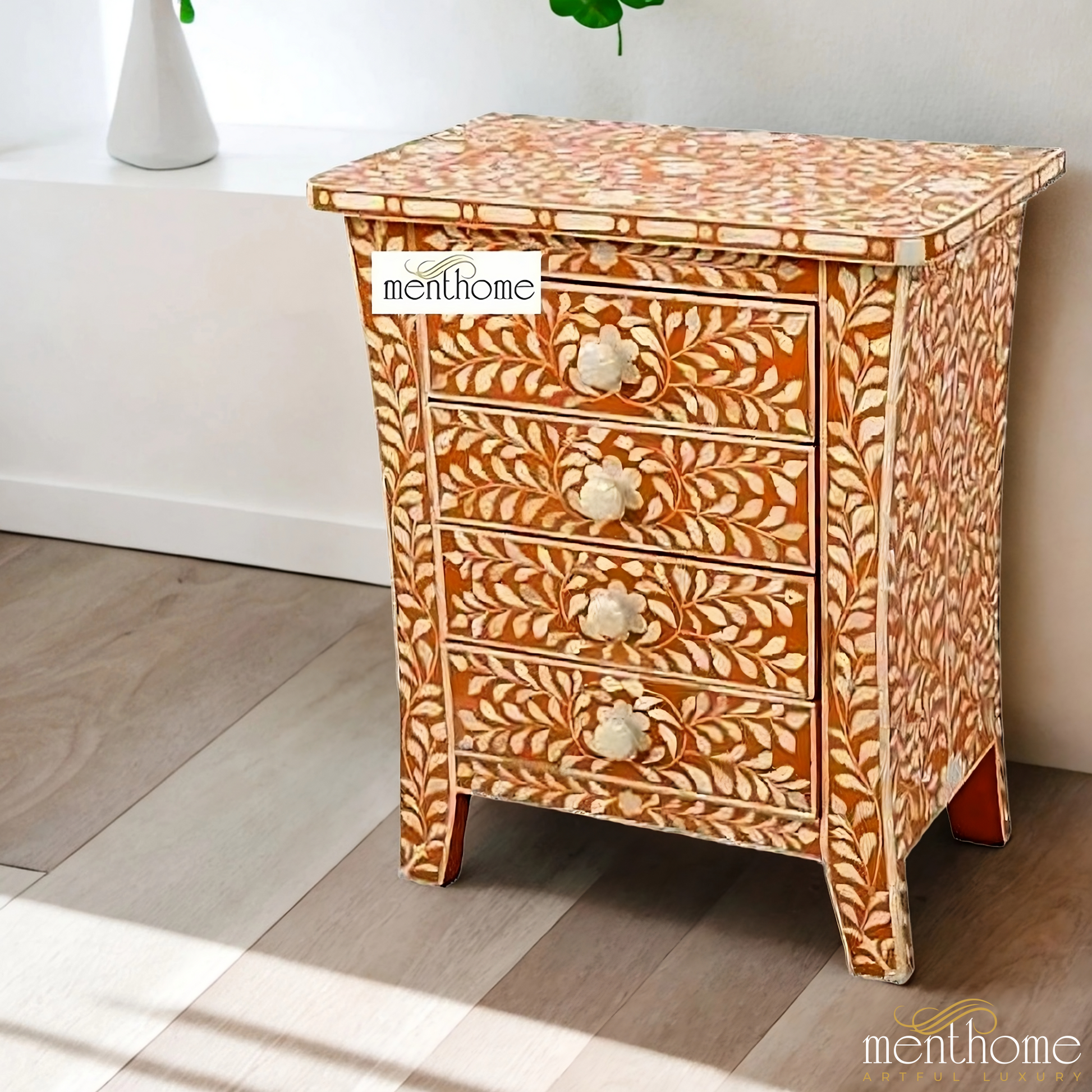 Bone Inlay Wood Bedside Table Design Bedside Handmade Bone Inlay Wooden Modern Floral Pattern Side table Furniture Handmade Wooden Table | Luxury Handmade Bedside Table