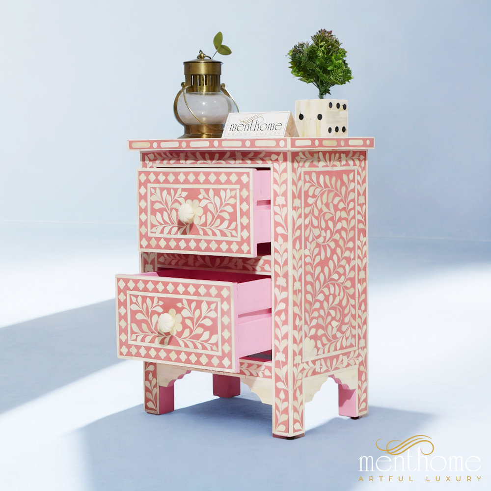 Dark Pink Bone Inlay Handmade Bedside Table with Two Drawers | Luxury Handmade Bedside Table