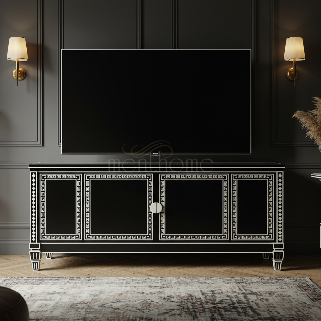 This luxurious TV cabinet features a striking black finish with intricate white inlay detailing in a classic Greek key pattern. Designed to blend timeless elegance with modern functionality, it offers ample storage space behind four doors, perfect for organizing media devices, games, and accessories. Elevated on tapered legs, this piece complements upscale interiors with its clean lines and sophisticated craftsmanship.