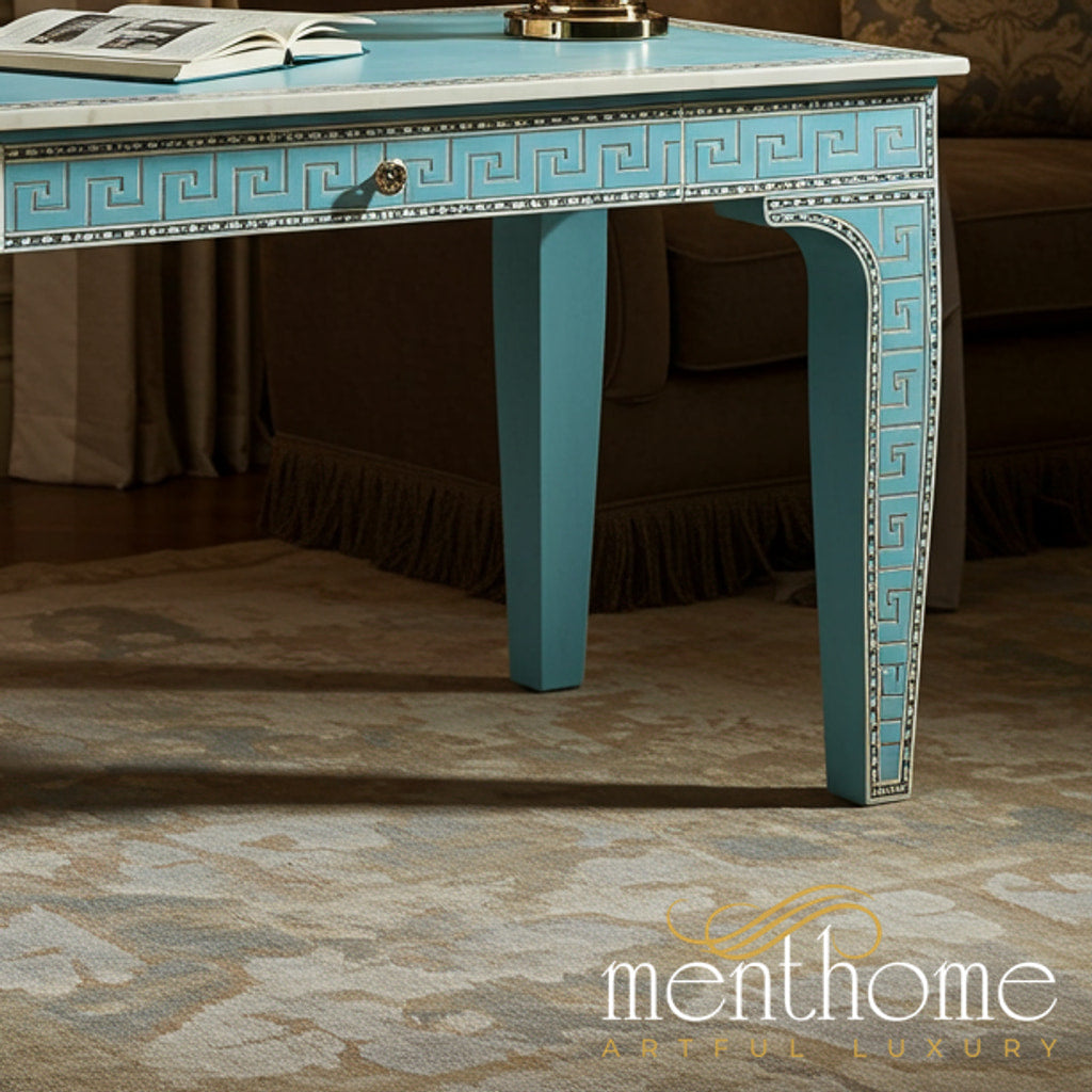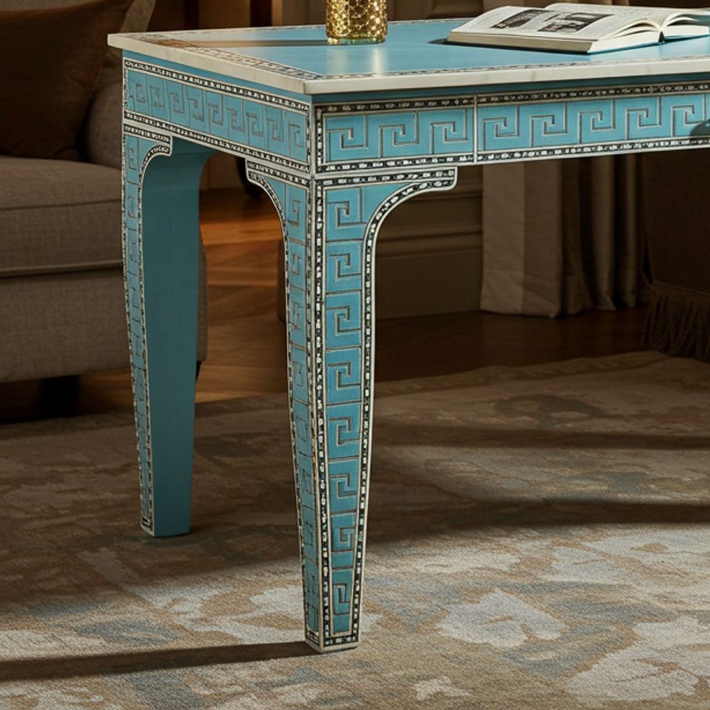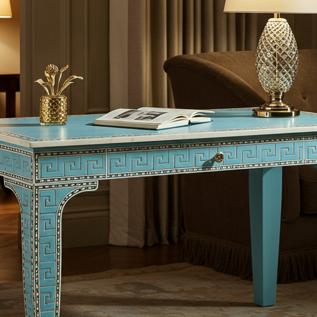 Elegant Blue Decorative Writing Desk with Greek Key Design | Luxury Handmade Desk