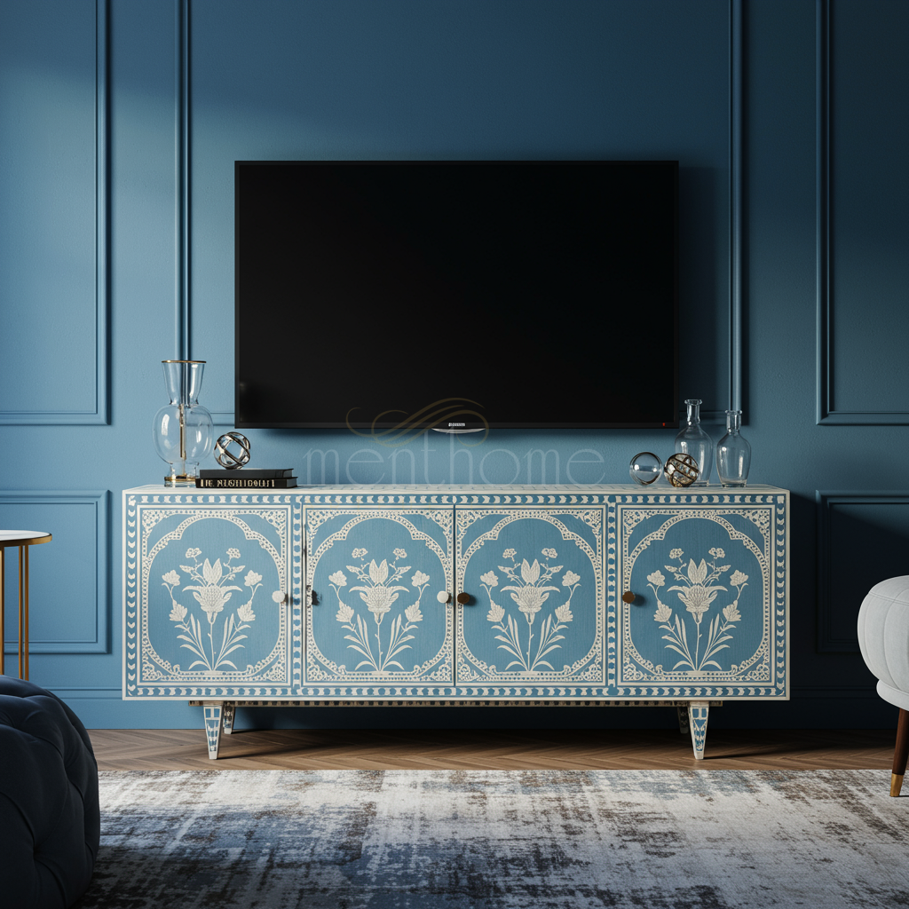 This exquisite TV cabinet features intricate floral inlay work set against a calming blue backdrop. Crafted with attention to detail, it combines traditional artistry with modern functionality, offering ample storage space concealed behind four ornately decorated doors. Ideal for showcasing a television while adding a luxurious focal point to living room interiors.