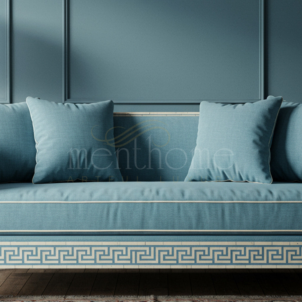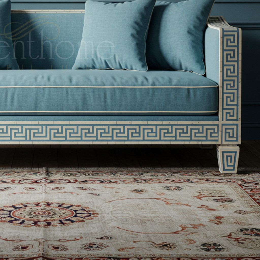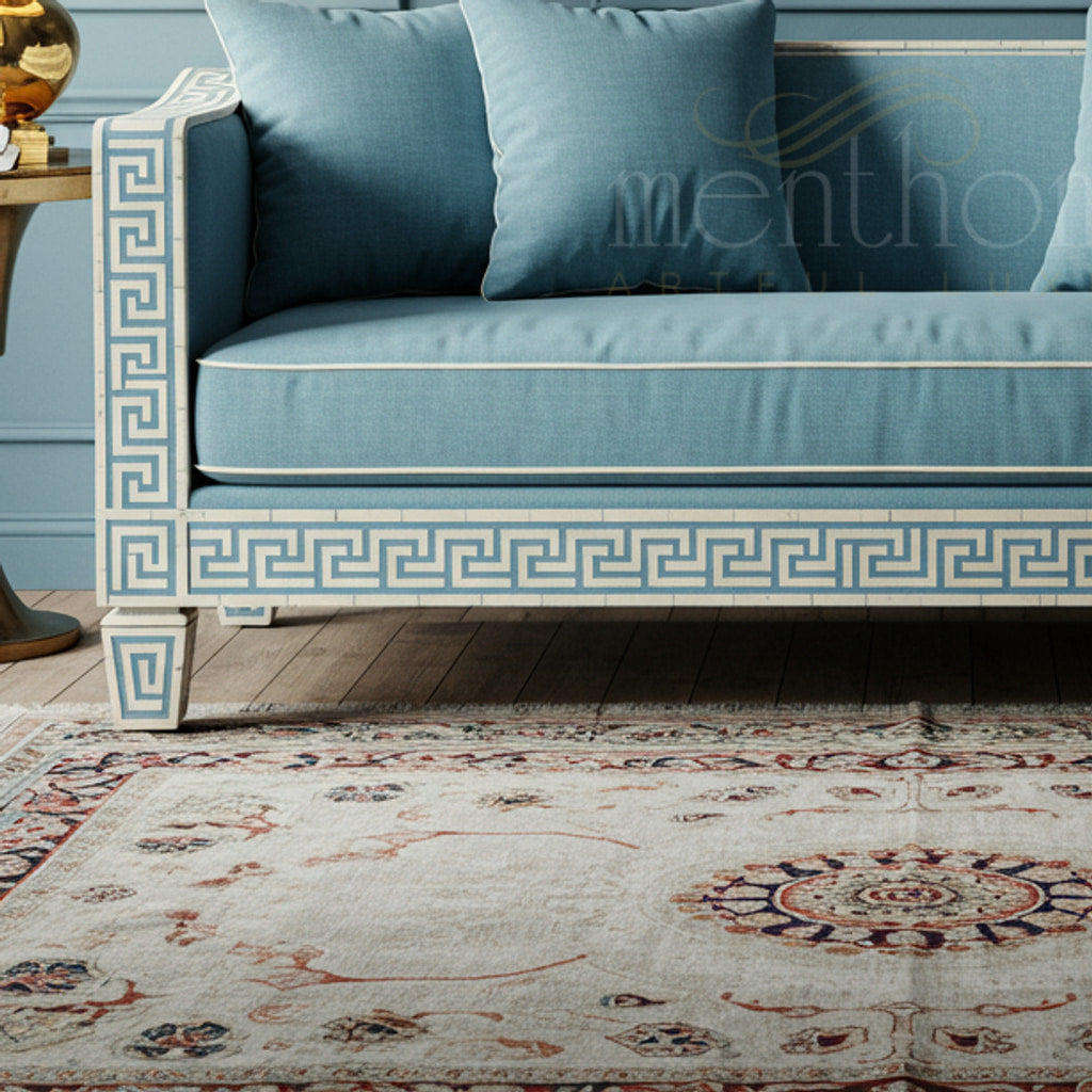 Elegant Blue Inlay Greek Key Sofa | Luxury Handmade Sofa