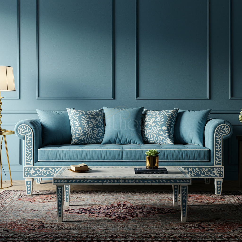 Elegant Blue Inlay Sofa with Floral Motif | Luxury Handmade Sofa