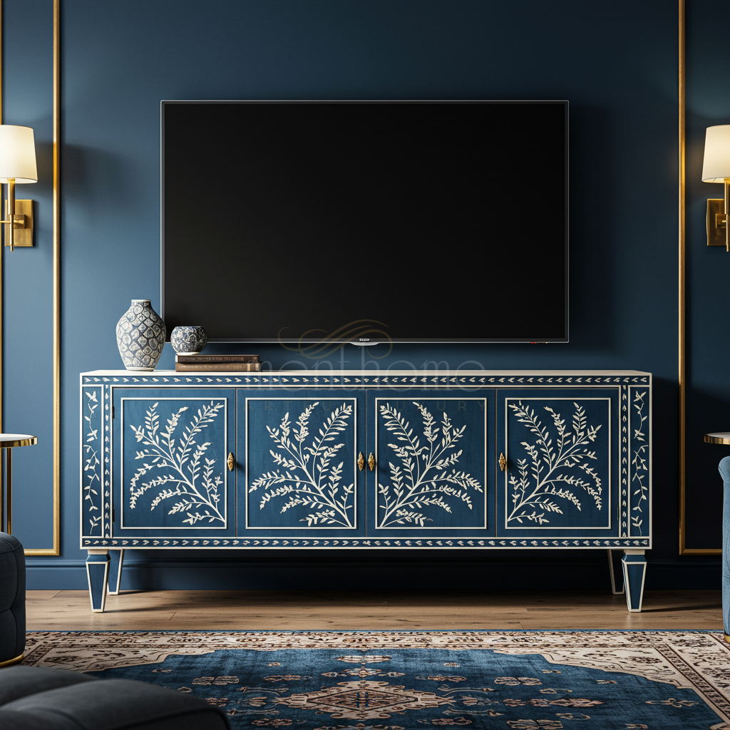 Elegant Blue Inlay TV Cabinet with Botanical Motif | Luxury Handmade TV Cabinet