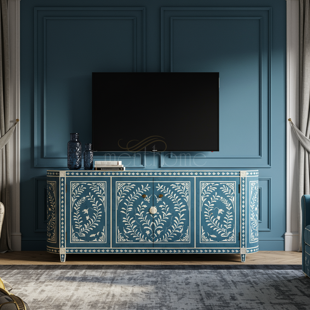 Elegant Blue Inlay TV Cabinet with Floral Motif | Luxury Handmade TV Cabinet