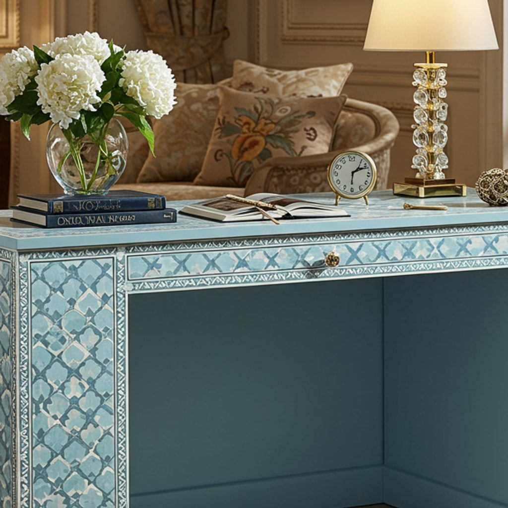Elegant Blue Patterned Wooden Desk | Luxury Handmade Desk
