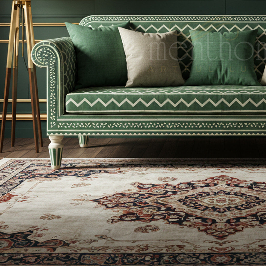 This exquisite inlay sofa features intricate geometric patterns on rich green upholstery, embodying luxury and traditional craftsmanship. Perfect for adding a statement piece in sophisticated living spaces, this sofa combines comfort with a distinct artisan touch.