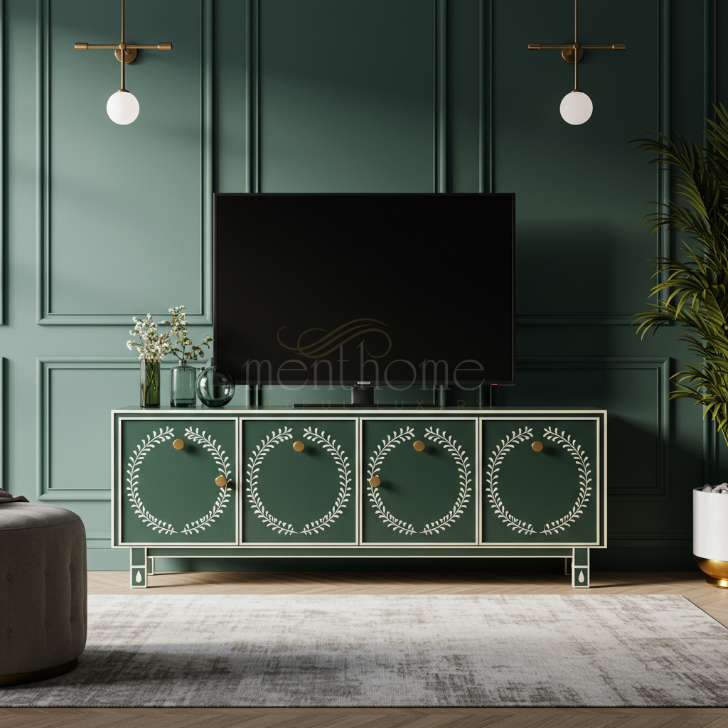 This exquisitely crafted TV cabinet features a deep green finish accented with intricate white inlay designs framed within circular wreath patterns on each door. The piece perfectly blends classic elegance with modern utility, offering ample storage behind four doors with stylish gold-tone knobs. Its sturdy construction and carefully painted borders add refined sophistication to any living space.