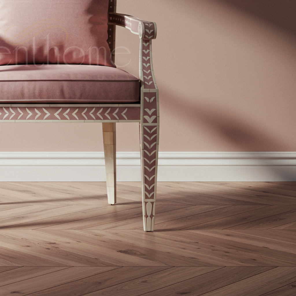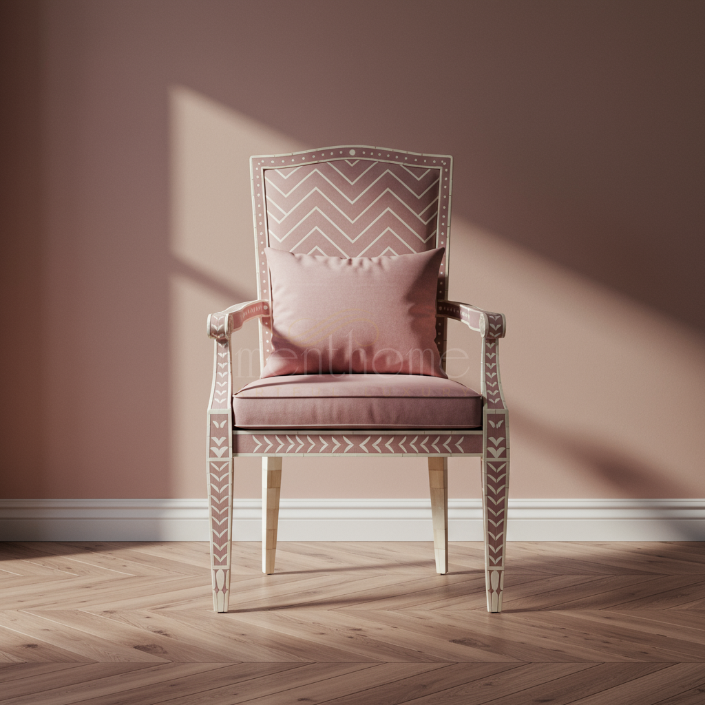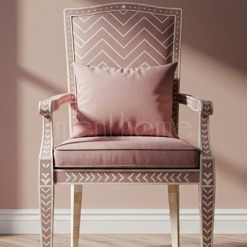 This sophisticated Inlay Chair features a hand-crafted wooden frame adorned with intricate white geometric inlay patterns. Upholstered in a soft, muted pink fabric with a matching cushion, it offers both comfort and a stylish statement perfect for classic and contemporary interiors.
