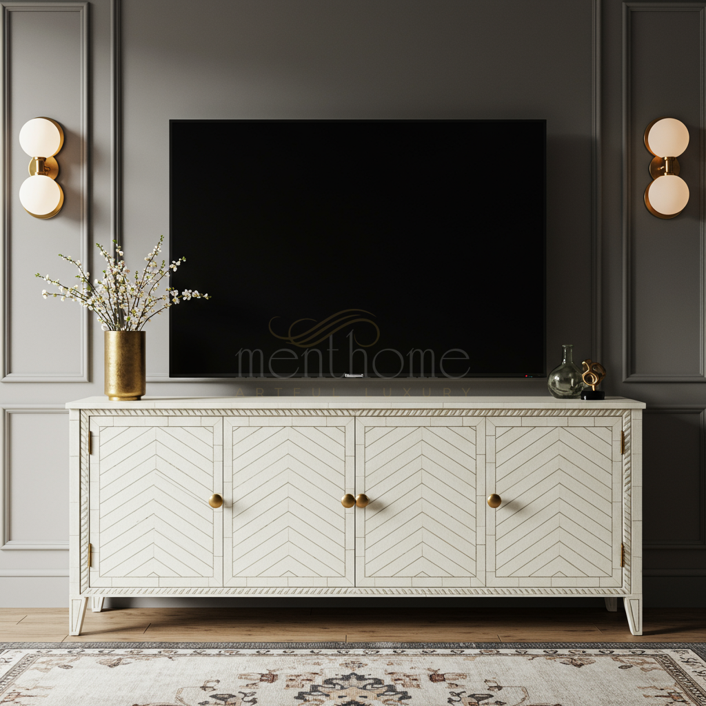 This exquisite TV cabinet features a sophisticated chevron inlay design crafted to elevate any living space. Finished in a soft ivory tone with subtle gold accents, it perfectly blends classic luxury with modern functionality. The cabinet offers ample storage with four doors, ideal for organizing media equipment and accessories while maintaining a refined aesthetic.