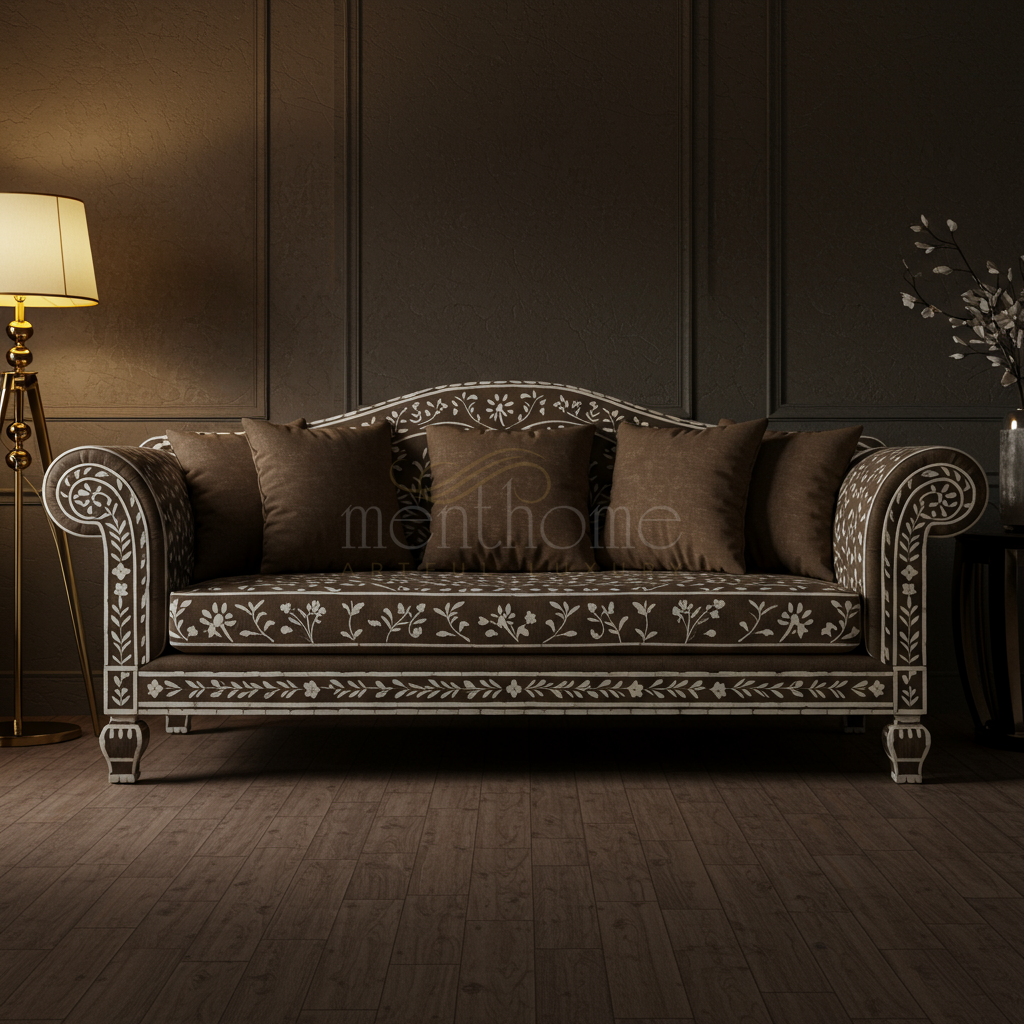 This luxurious sofa features intricate floral inlay designs on a rich brown fabric, complemented by plush cushions for exceptional comfort. Crafted with detailed woodworking and artistic flair, it brings a sophisticated charm to any living space.