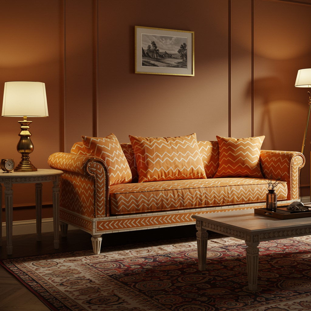 This sophisticated inlay sofa features a striking orange upholstery with zigzag patterns, complemented by a finely detailed wooden frame. Perfect for adding a warm, vibrant touch to traditional and contemporary living spaces, it combines both comfort and artistry.