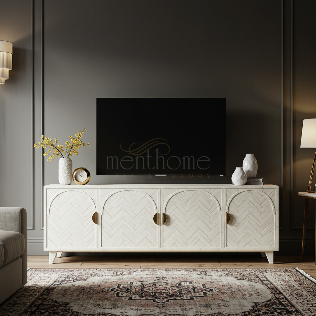 Elegant Inlay TV Cabinet with Arch Design | Luxury Handmade TV Cabinet