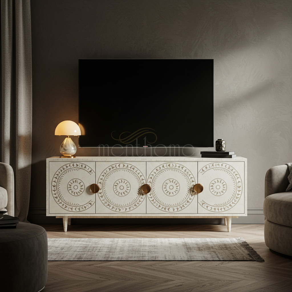Elegant Inlay TV Cabinet with Circular Motif Design | Luxury Handmade TV Cabinet