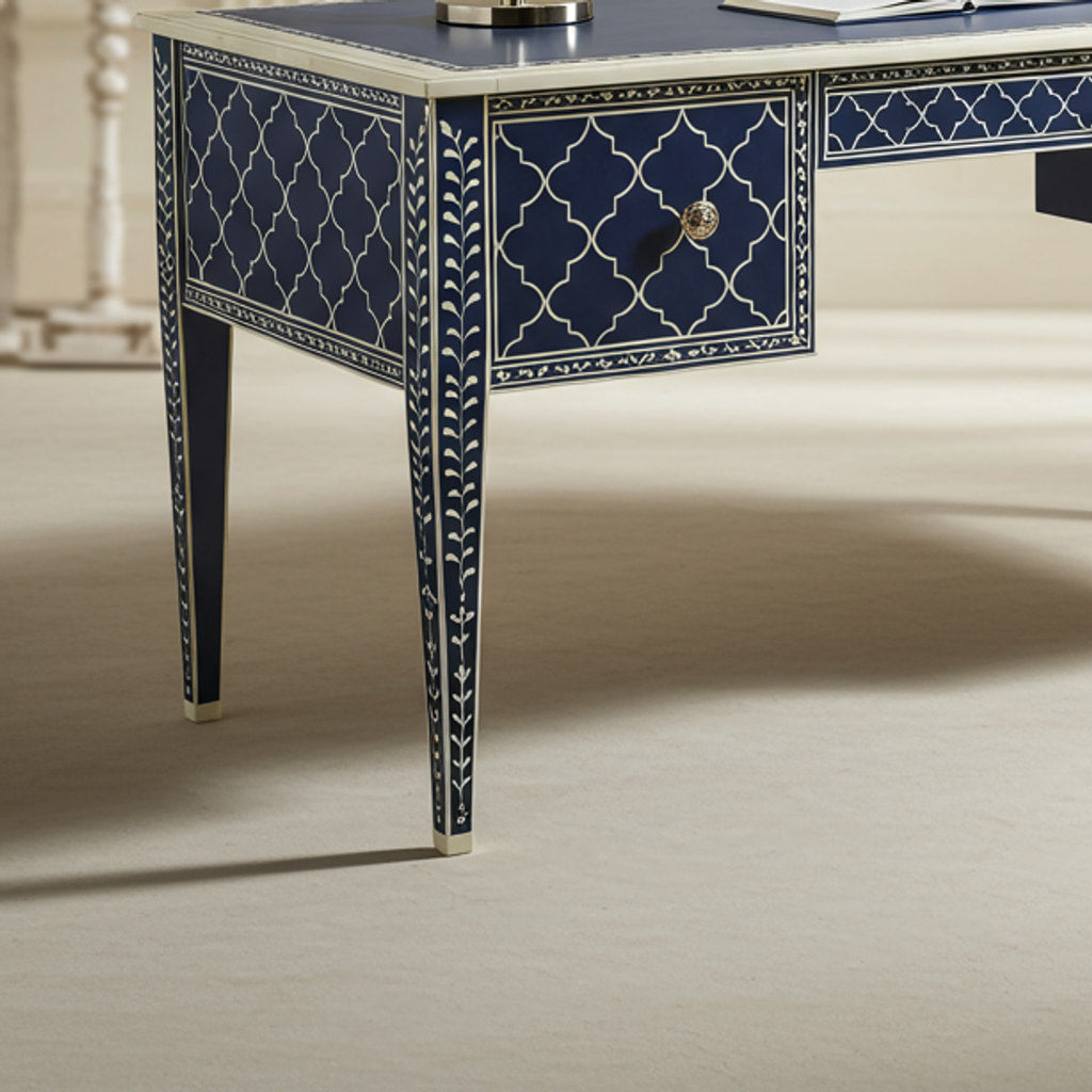 This beautifully crafted navy blue writing desk features intricate white geometric patterns and elegant detailing, perfect for enhancing any sophisticated workspace or living area. Equipped with multiple drawers for ample storage, it combines aesthetics with functionality to elevate your interior decor.