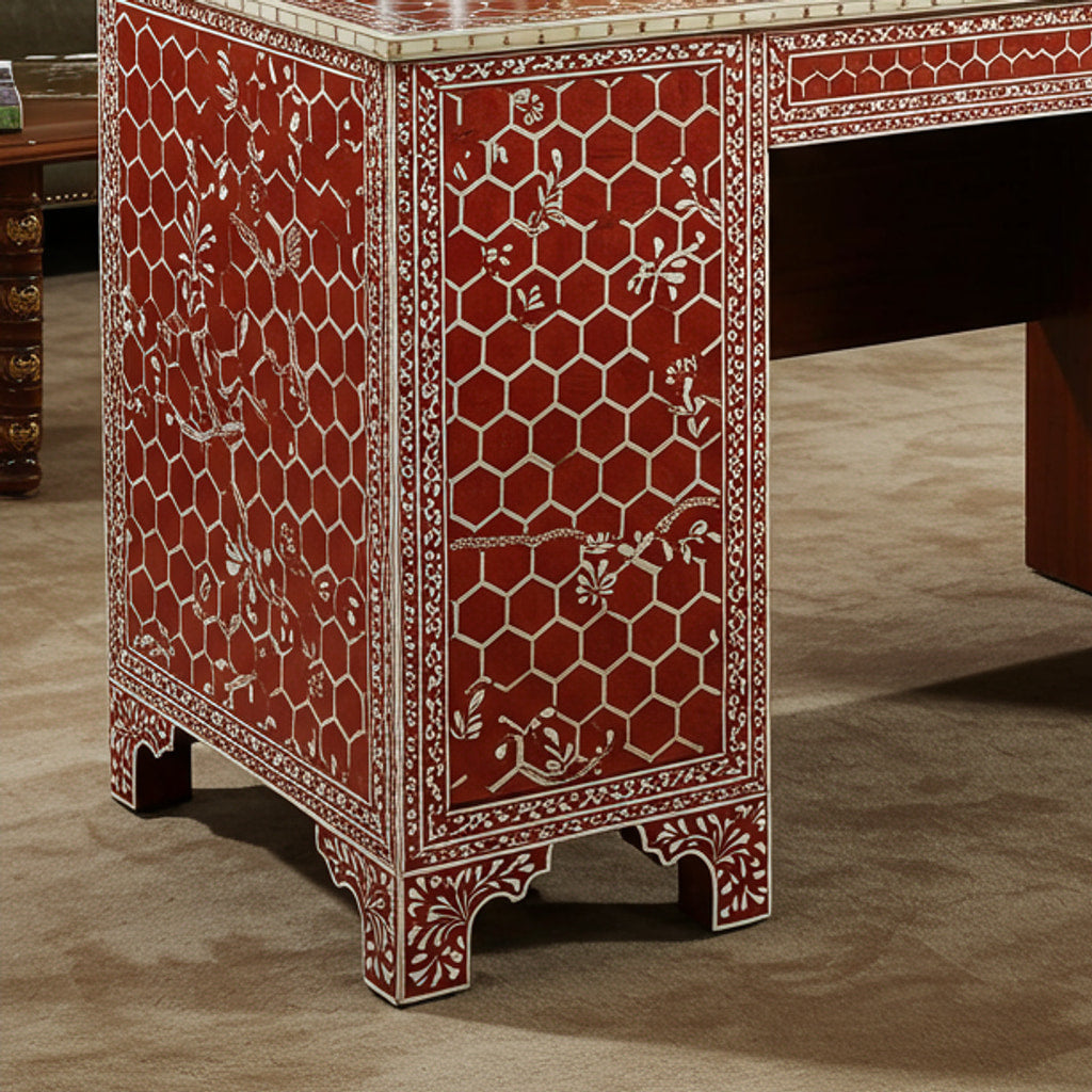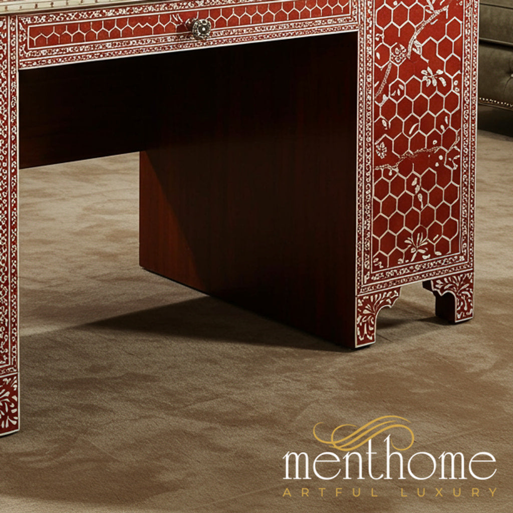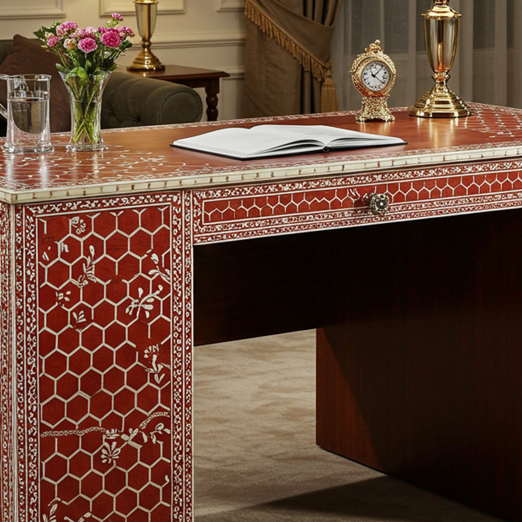 Elegant Red Wooden Desk with Intricate White Pattern | Luxury Handmade Desk