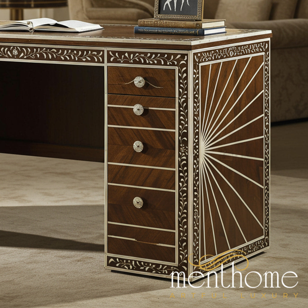 This exquisite wooden office desk features detailed inlay work with a radiant sunburst pattern on the sides and delicate leaf motifs framing the edges. Designed for both functionality and style, the desk offers multiple drawers for ample storage, adorned with decorative knobs, making it a perfect centerpiece for sophisticated home or office settings.