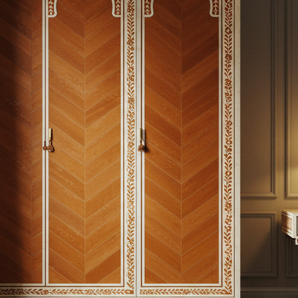 A beautifully crafted wooden wardrobe featuring intricate inlay patterns with a warm, natural finish. This two-door wardrobe combines functionality with classic design, perfect for adding a sophisticated touch to your bedroom.