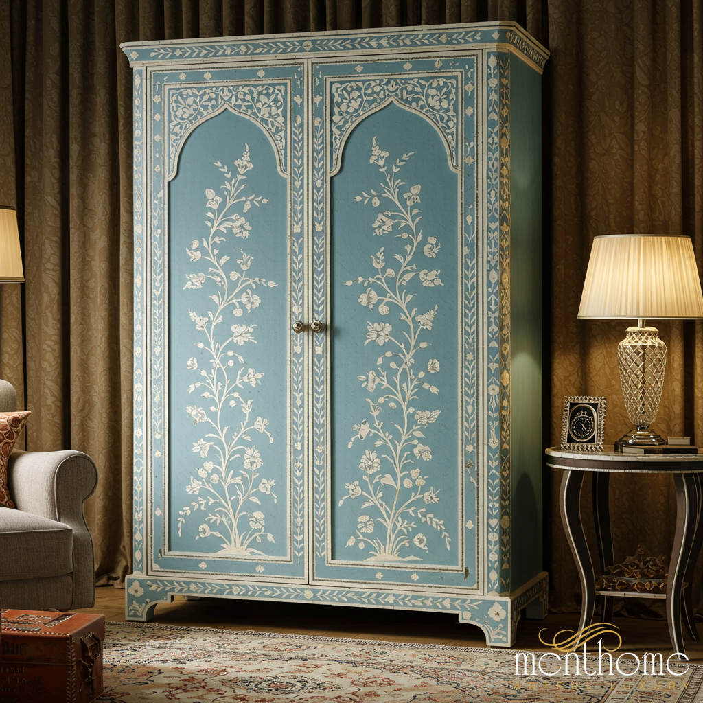 Hand-Painted Blue Floral Wooden Wardrobe | Luxury Handmade Wardrobe