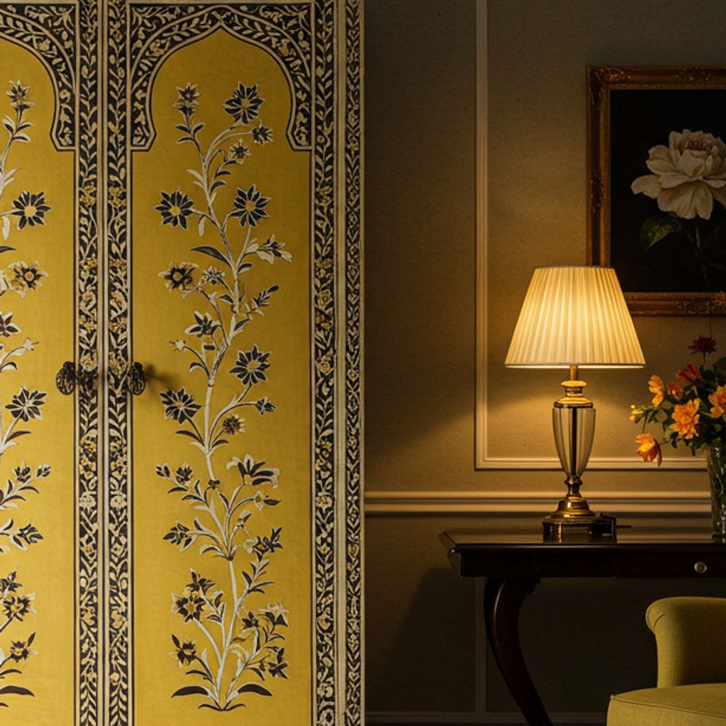 An elegant hand-painted armoire with intricate floral designs in mustard yellow and black. This cabinet offers a stylish storage solution that adds charm and vintage elegance to any room.