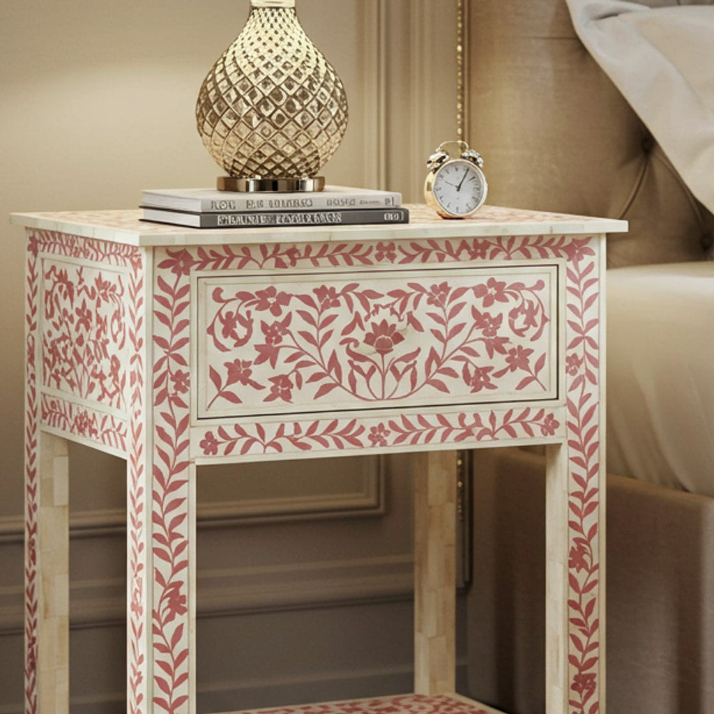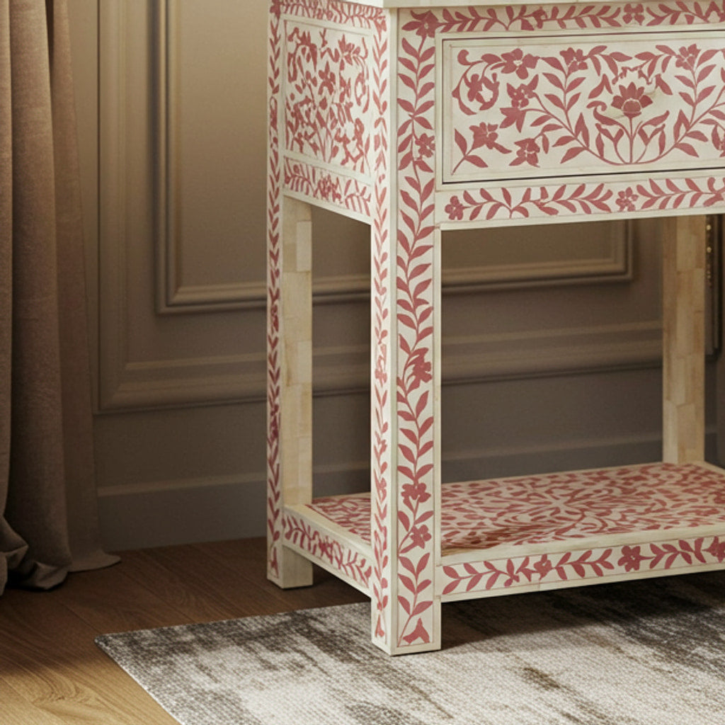 This beautifully crafted hand-painted nightstand features an intricate floral design in warm pink tones. It includes a spacious drawer and lower shelf for ample storage. Made from durable wood with a smooth finish, it adds both elegance and functionality to any bedroom setting.