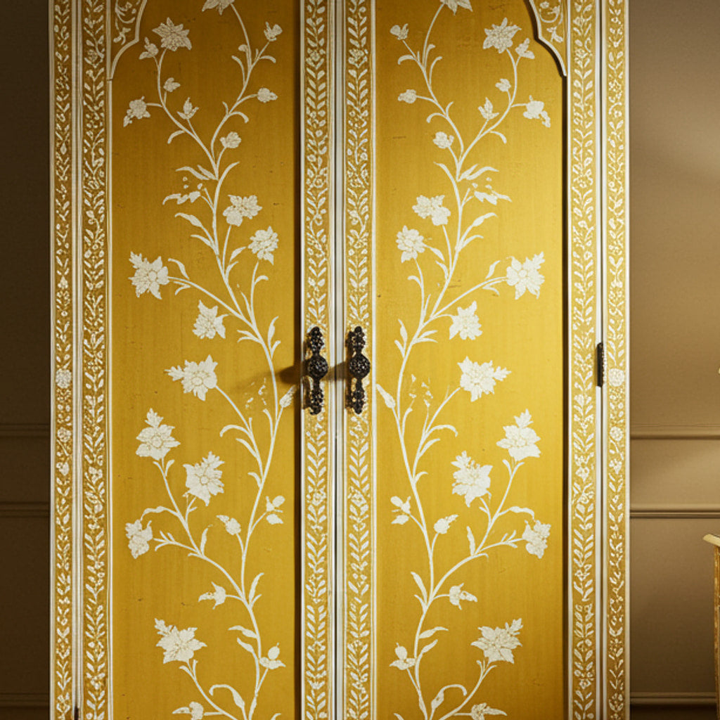 A beautifully hand-painted wardrobe cabinet featuring intricate white floral designs on a mustard yellow background. Crafted with elegant detailing and sturdy handles, this cabinet adds a touch of vintage charm and functional storage to any room.