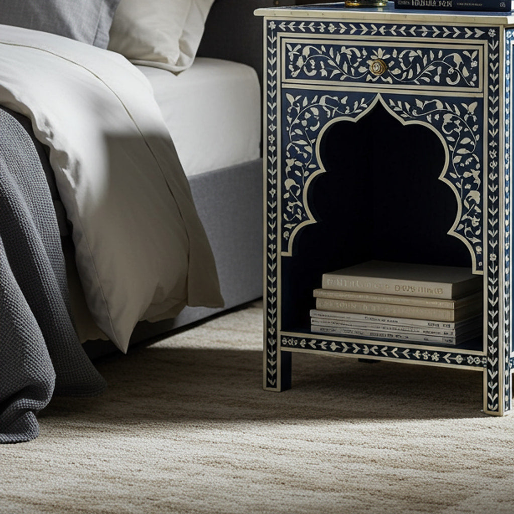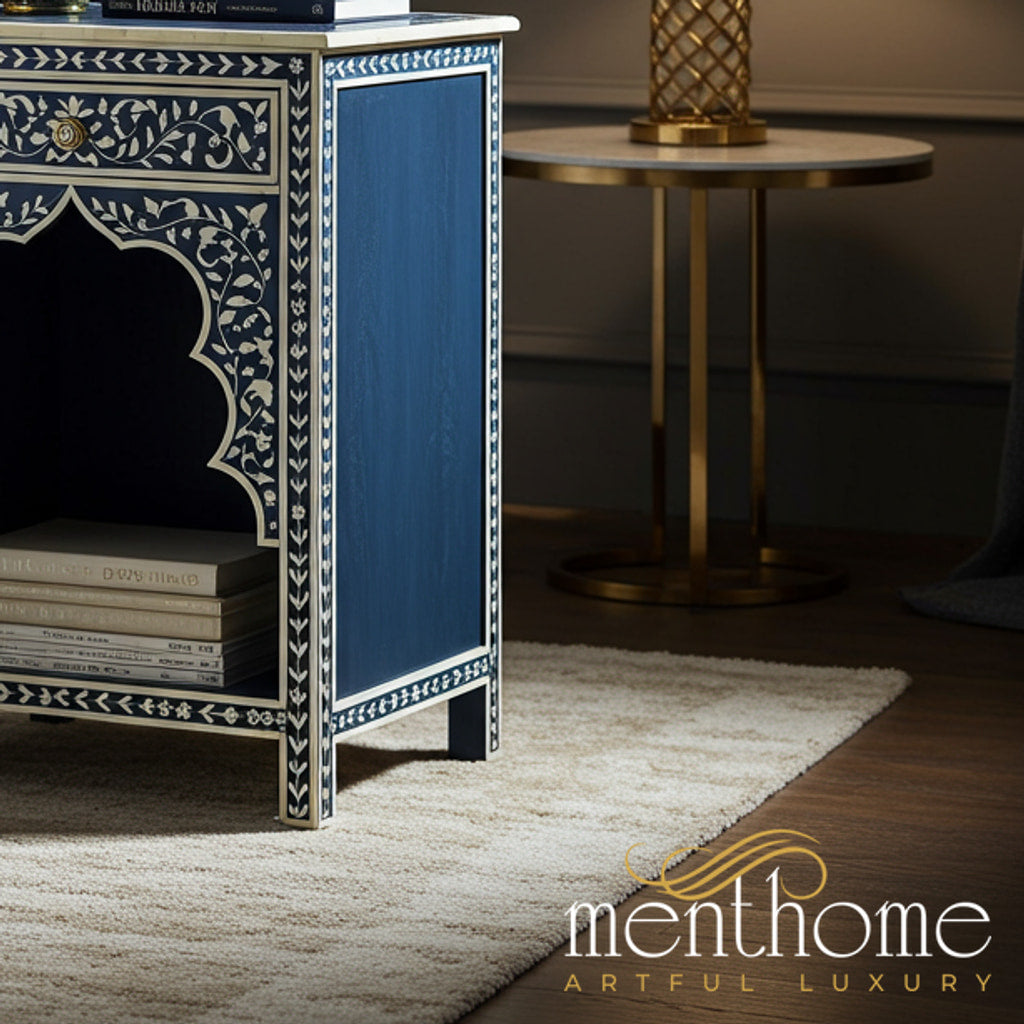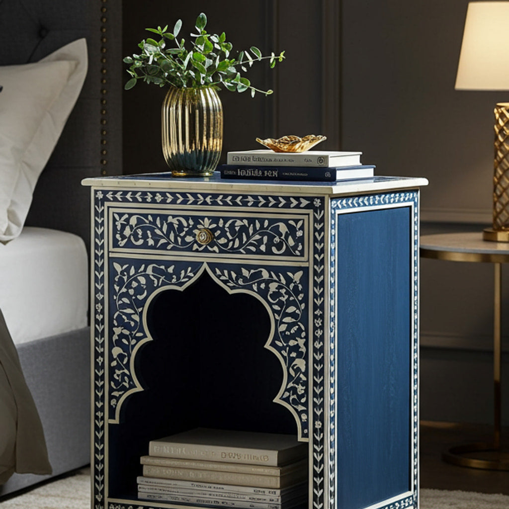 This exquisite handcrafted bedside table features intricate bone inlay work in a traditional floral and geometric pattern, highlighted in white against a deep blue background. Designed with a single drawer and an open lower shelf, it combines storage with style, perfect for keeping your nighttime essentials organized.