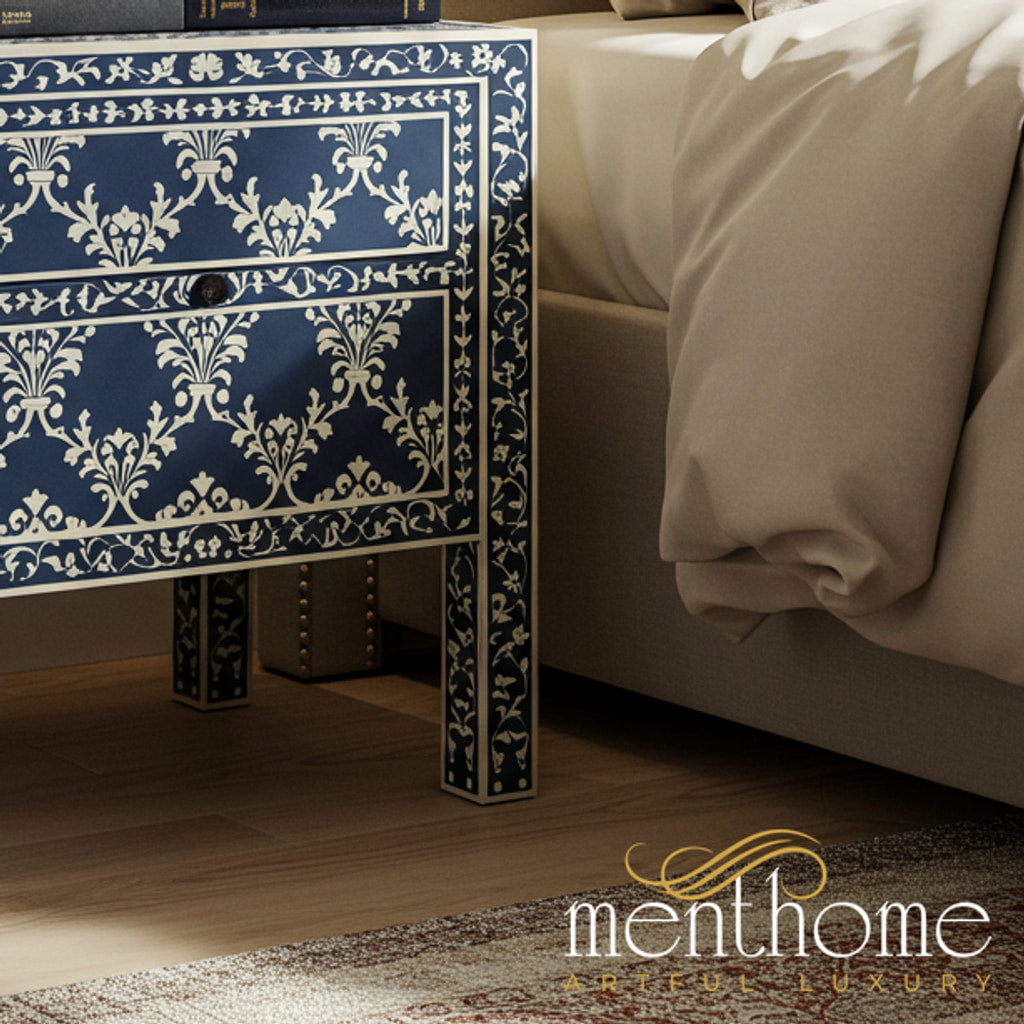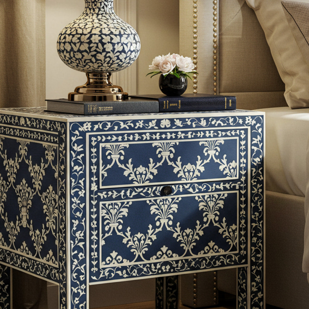 Handcrafted Blue and White Inlay Bedside Table | Luxury Handmade Bedside Table