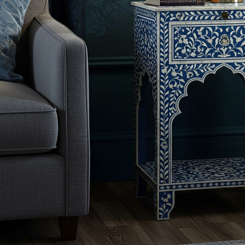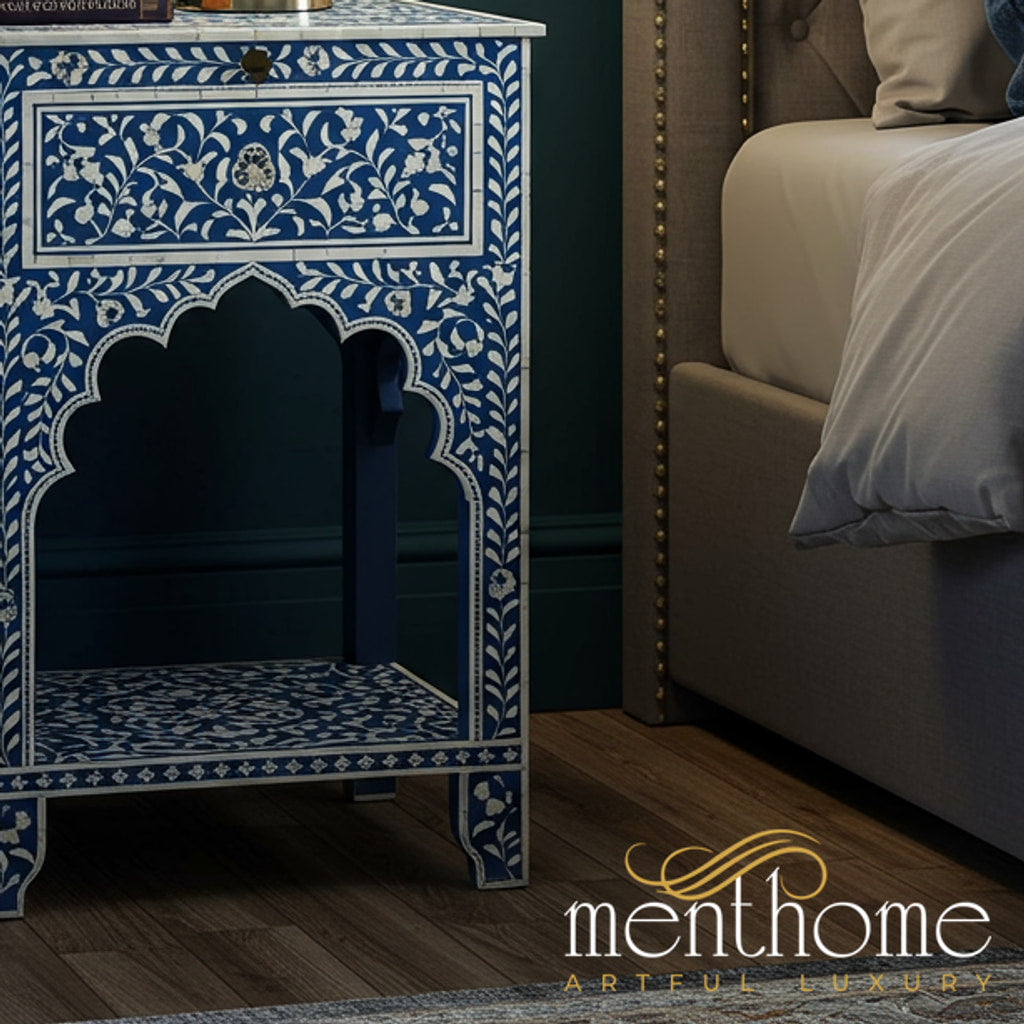 Handcrafted Blue and White Inlay Bedside Table | Luxury Handmade Bedside Table