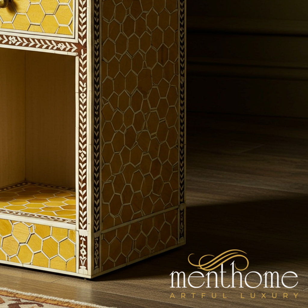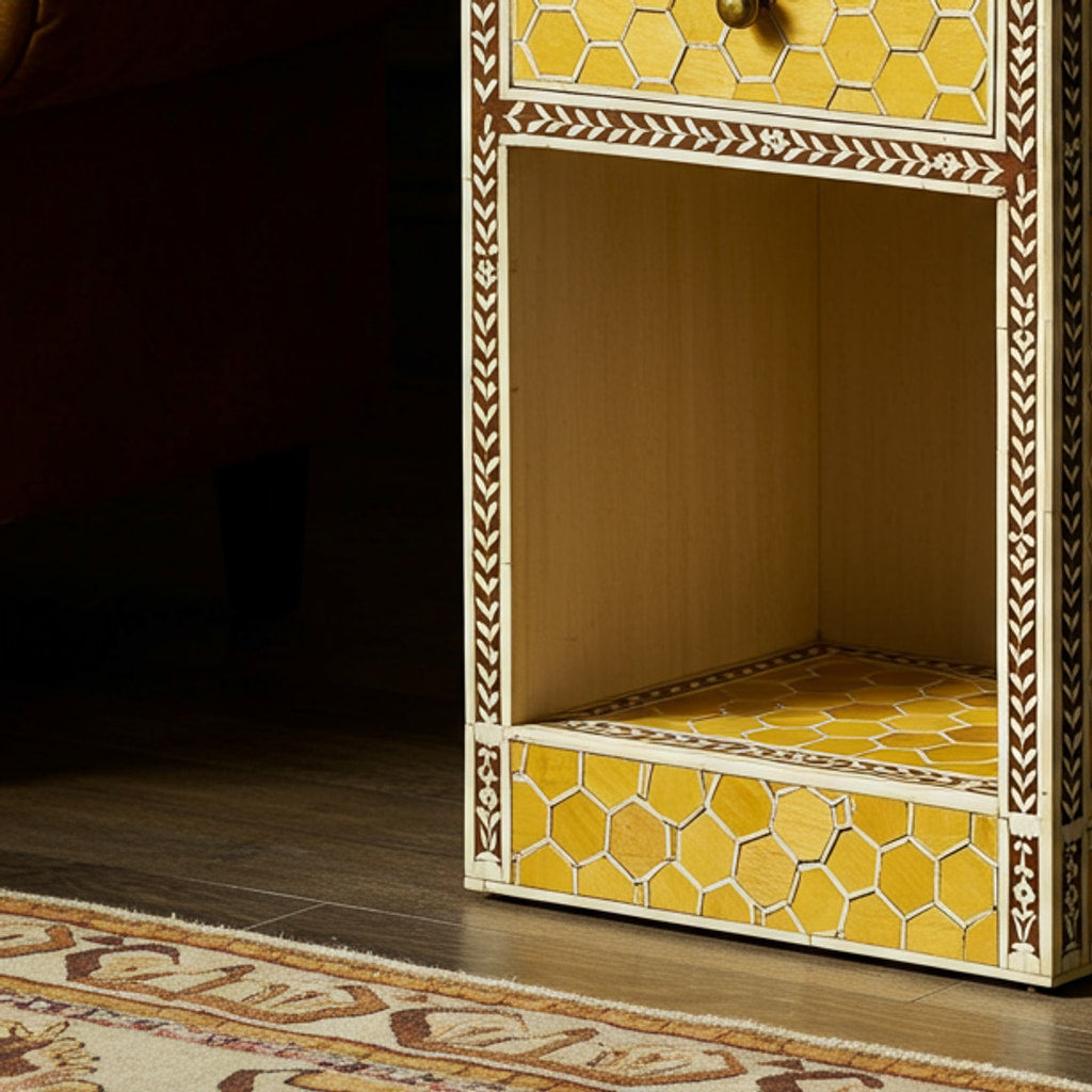 This elegant side table features intricate geometric patterns and a warm yellow finish, making it a perfect addition to your living room or bedroom. It includes a single drawer and an open storage space underneath for convenient storage.
